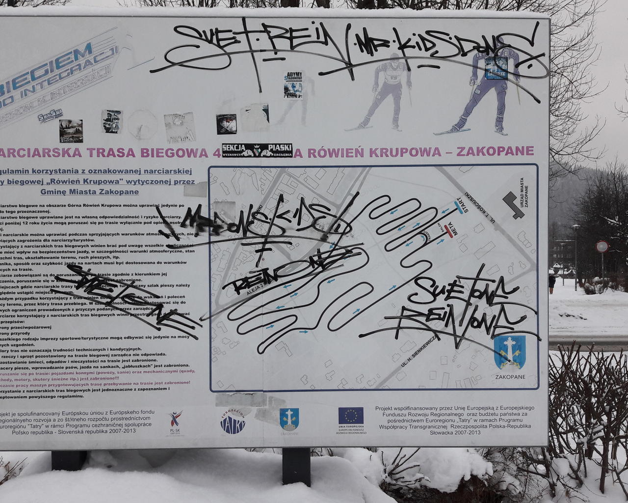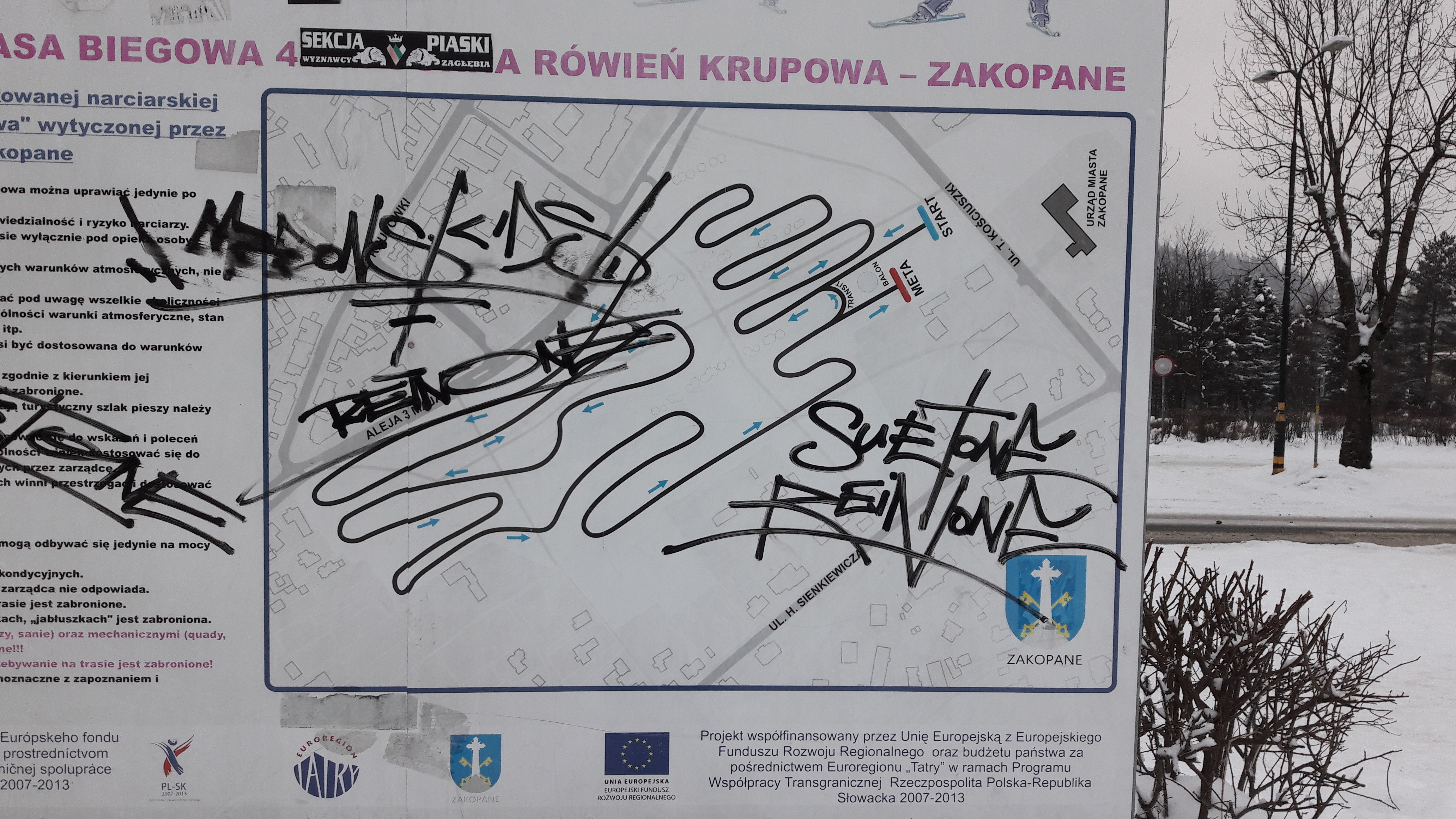Z przykrością zawiadamiamy, że po raz kolejny nieznani sprawcy zniszczyli i ukradli oznaczenia i tablice informacyjne narciarskiej trasy biegowej na Górnej Równi Krupowej.