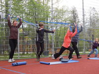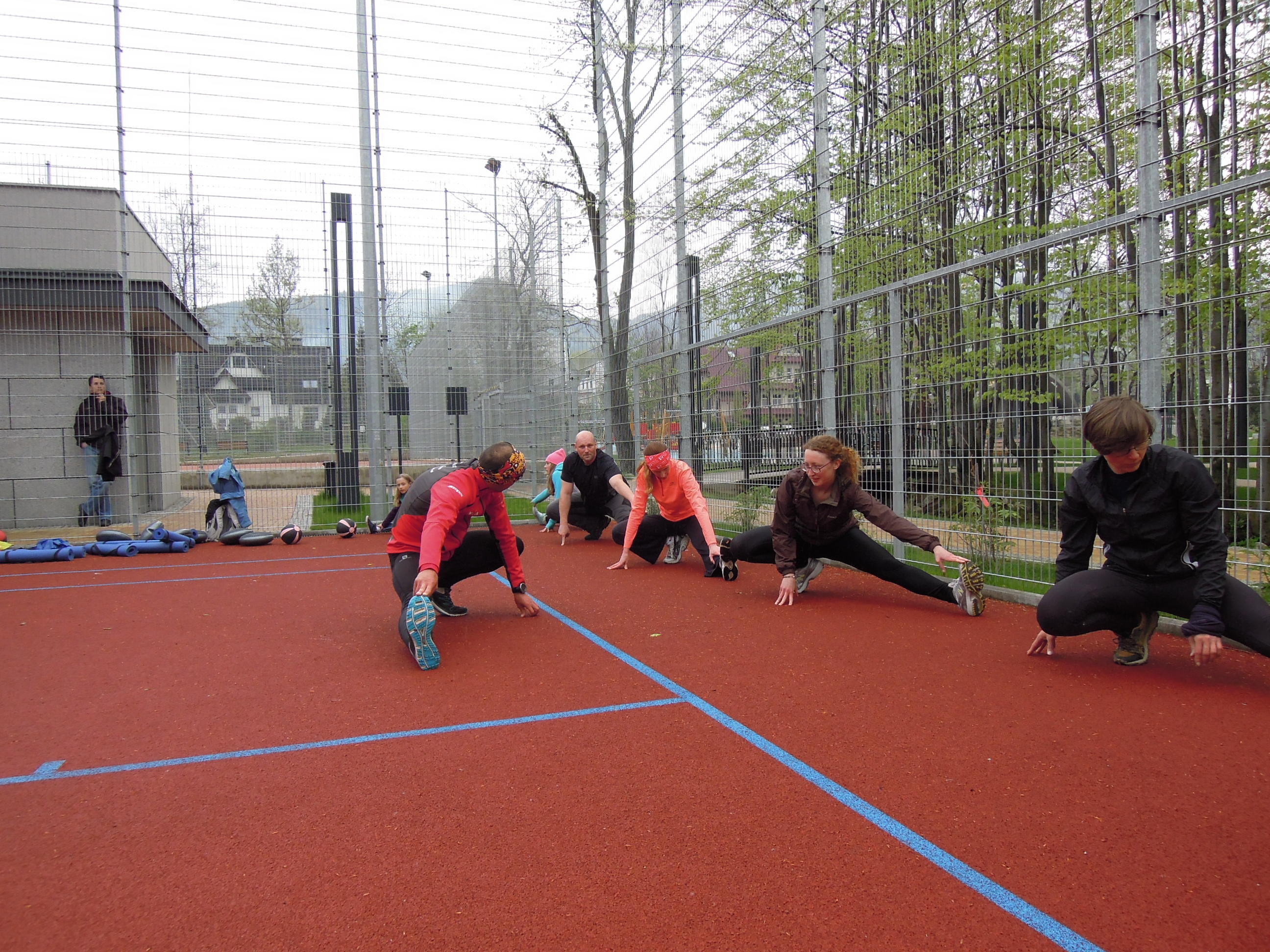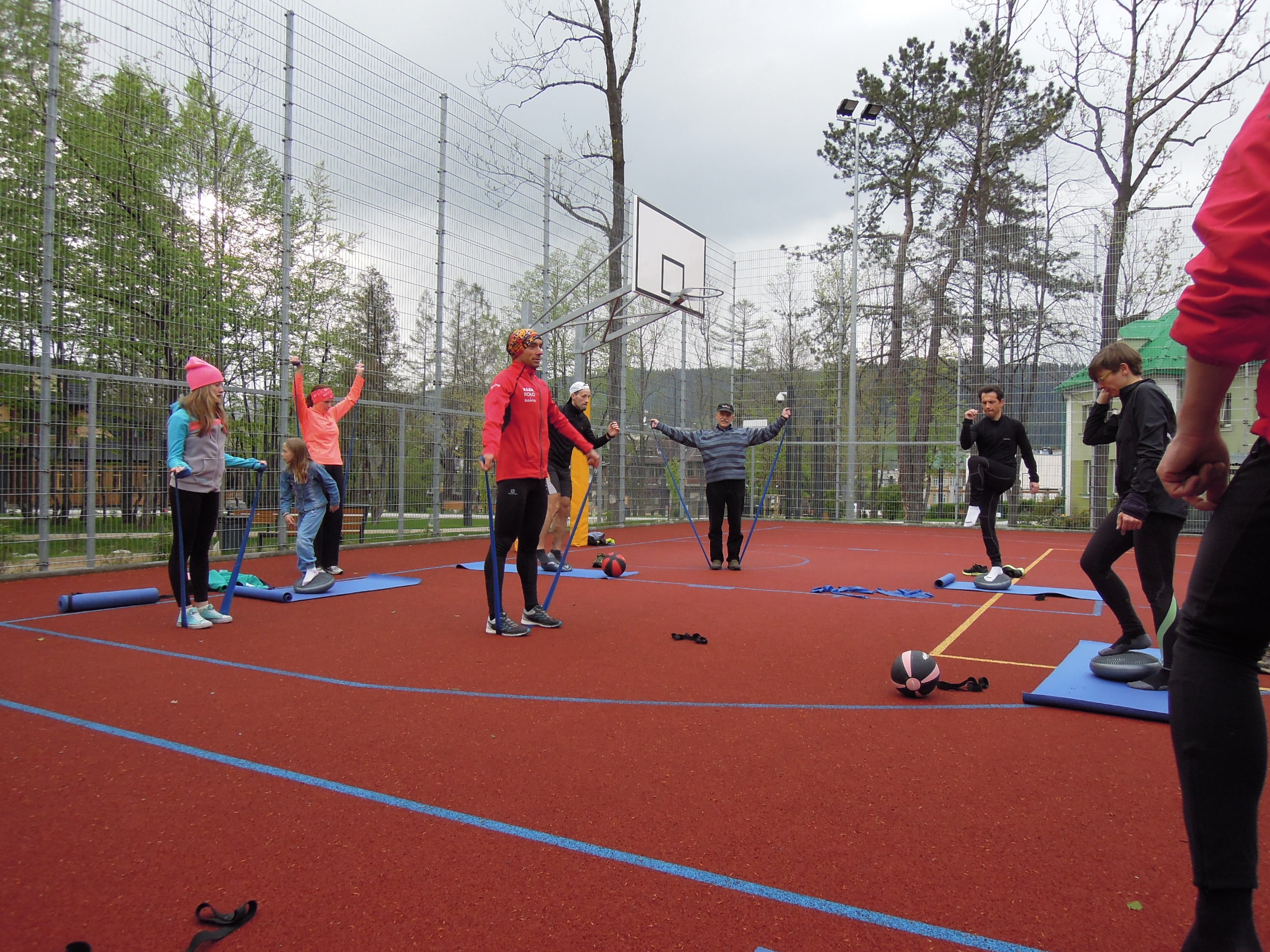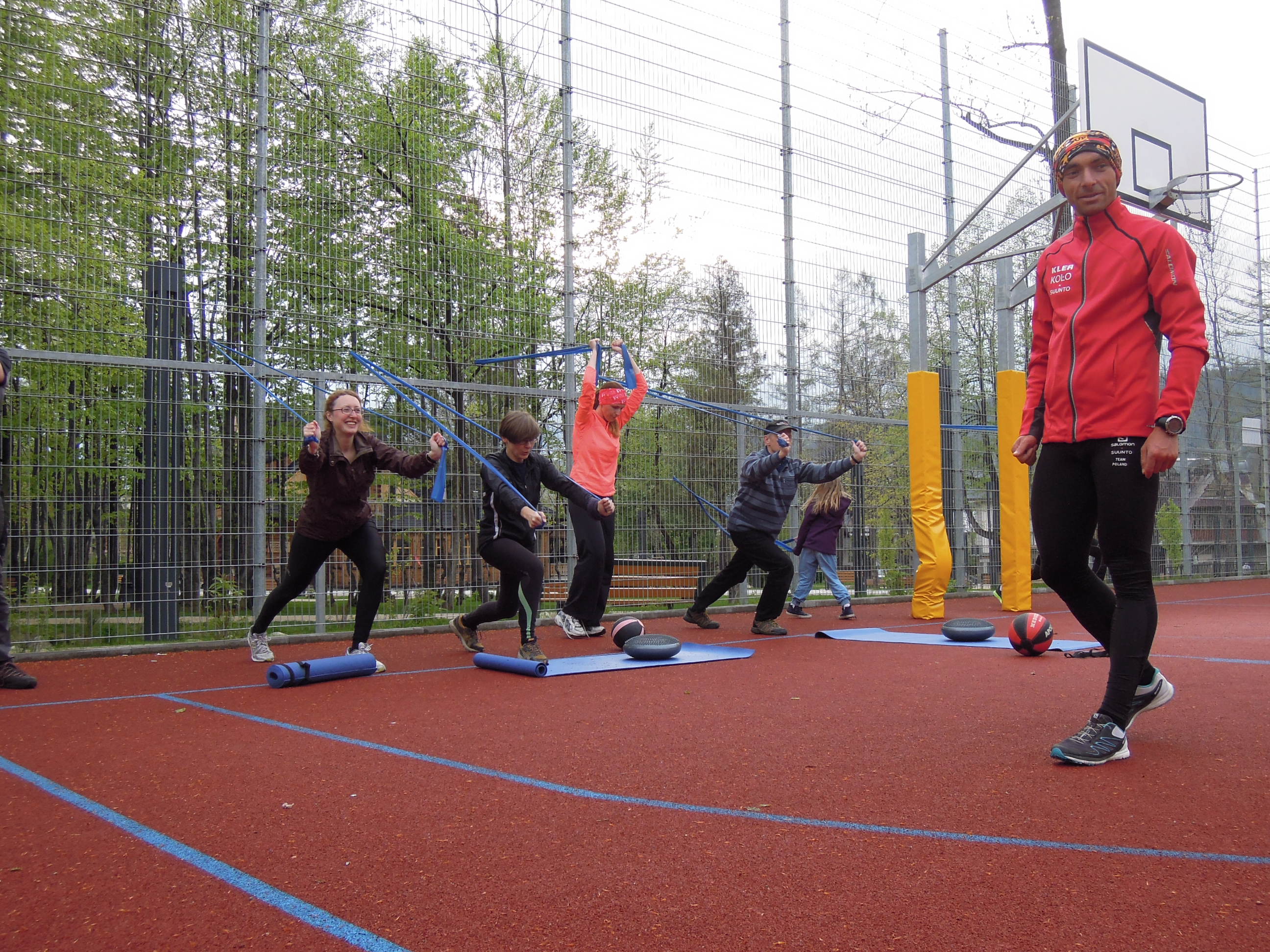 Uczestnicy zajęć wykonali ćwiczenia, które powinno się stosować w ramach rozgrzewki przed bieganiem. Zapoznali się również przyrządami, których można używać samodzielnie, a które zastąpić mogą wizyty na siłowni. Ich umiejętne stosowanie zapewni wzmocnienie wszelkich partii mięśni oraz ścięgien, poddawanych obciążeniom podczas biegów.