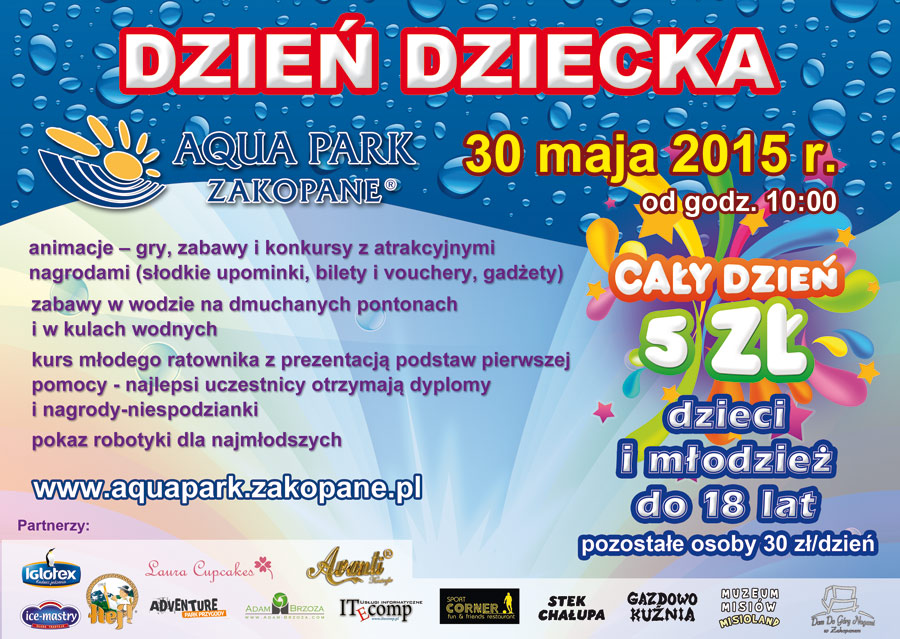 Aqua Park Zakopane zaprasza w sobotę, 30 maja, od godz. 10.00 na obchody Dnia Dziecka. Szczegóły na plakacie.