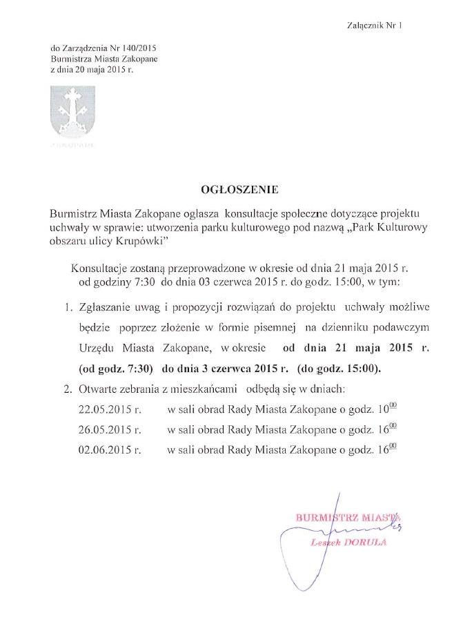 Od 21 maja 2015 r. od godz. 7:30 do 3 czerwca 2015 r. do godz. 15:00 prowadzone będą konsultacje społeczne, dotyczące projektu uchwały o przyjęciu na obszarze ulicy Krupówki parku kulturowego. Uwagi do zaproponowanych rozwiązań można będzie zgłaszać przez Internet, korespondencyjnie oraz podczas organizowanych spotkań. W ramach konsultacji zostaną zorganizowane trzy otwarte zebrania mieszkańców z zaproszonymi gośćmi, które odbędą się w dniach: