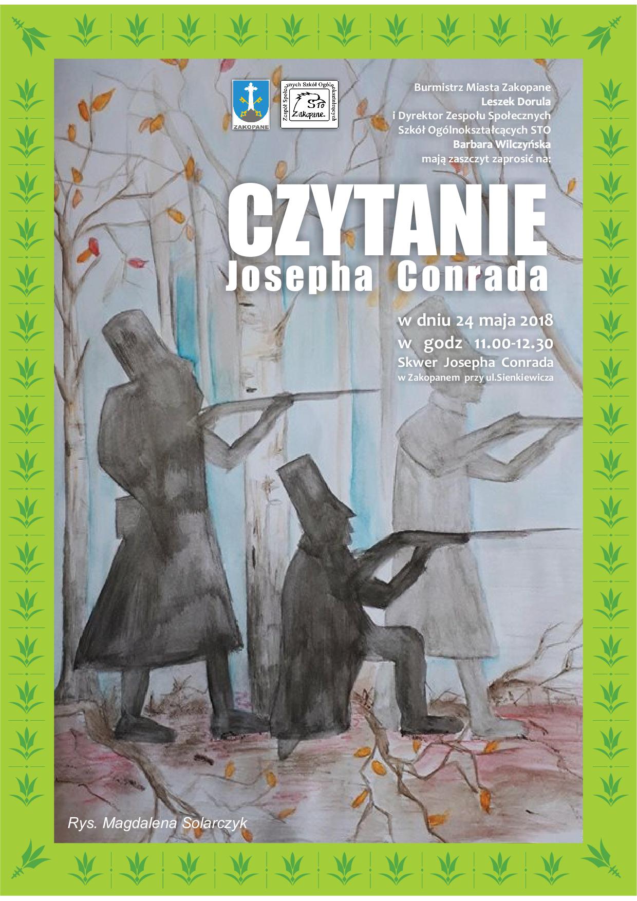 Burmistrz Miasta Zakopane Leszek Dorula i Dyrektor Zespołu Społecznych Szkół Ogólnokształcących STO Barbara Wilczyńska zapraszają na Czytanie Josepha Conrada 24 maja 2018 w godz. 11.00 - 12.30 na Skwerze Conrada przy ul. Sienkiewicza.
