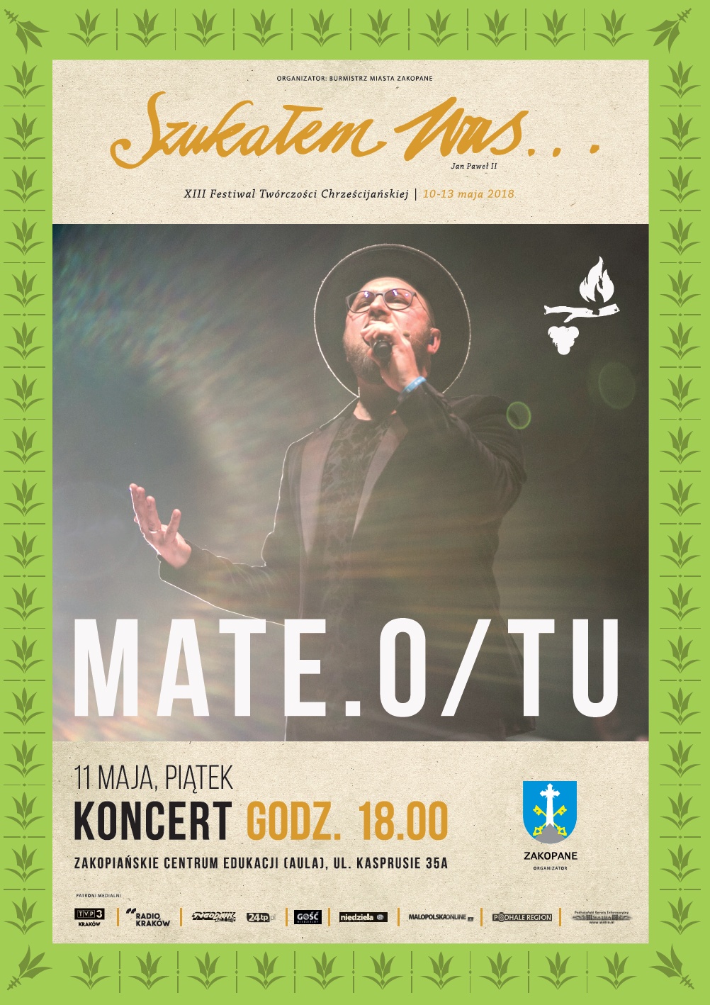 W piątek 11 maja o godz. 18:00 w Zakopiańskim Centrum Edukacji, ul. Kasprusie 35a, w ramach XIII Festiwalu Twórczości Chrześcijańskiej "Szukałem Was..." odbędzie się koncert zespołu Mate.O/TU.