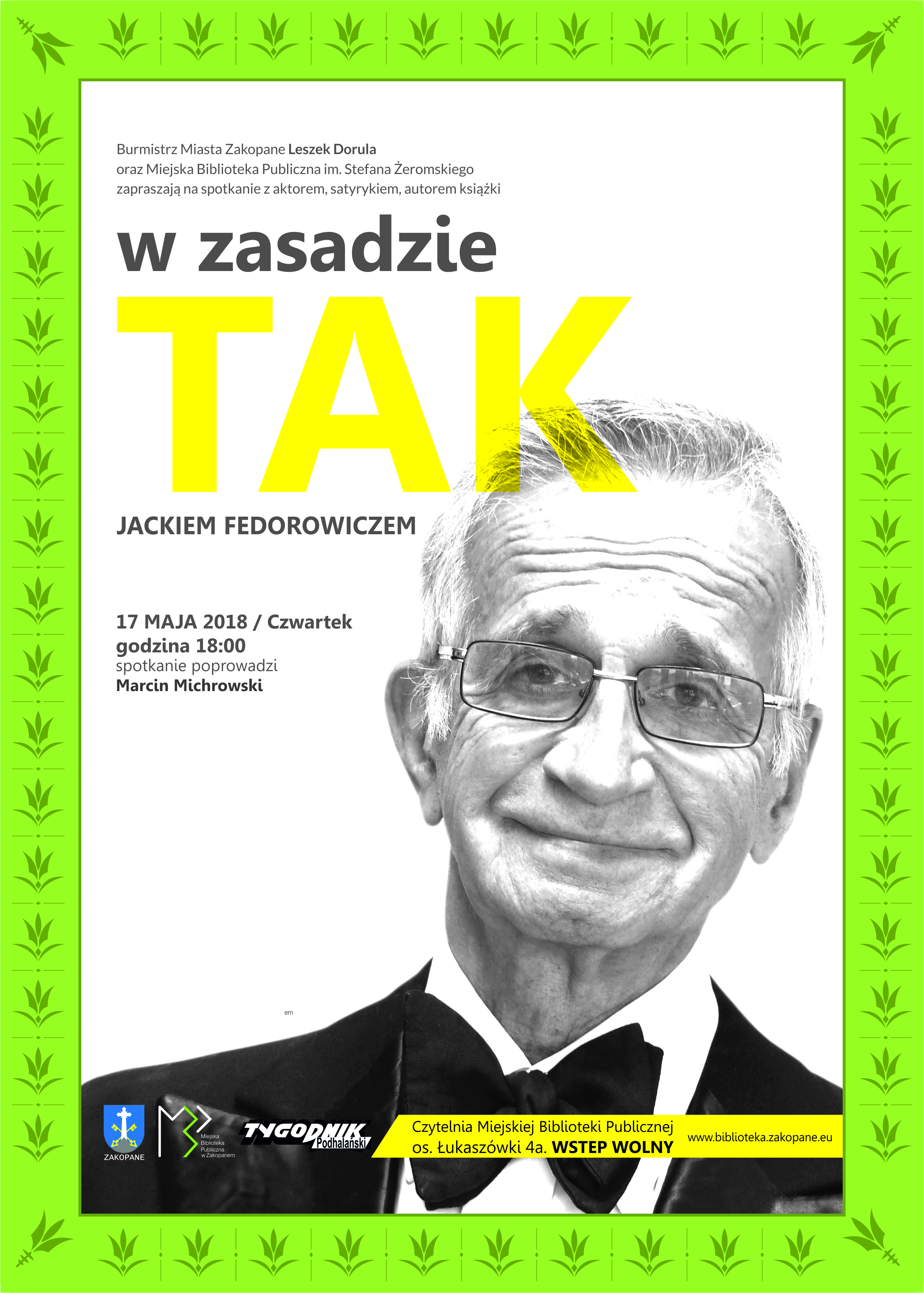 Burmistrz Miasta Zakopane Leszek Dorula oraz Miejska Biblioteka Publiczna im. Stefana Żeromskiego zapraszają na spotkanie z aktorem, satyrykiem, autorem książki W ZASADZIE TAK Jackiem Fedorowiczem 17.05.2018 r. /czwartek/ godz. 18.00, Czytelnia Miejskiej Biblioteki Publicznej, os. Łukaszówki 4a.