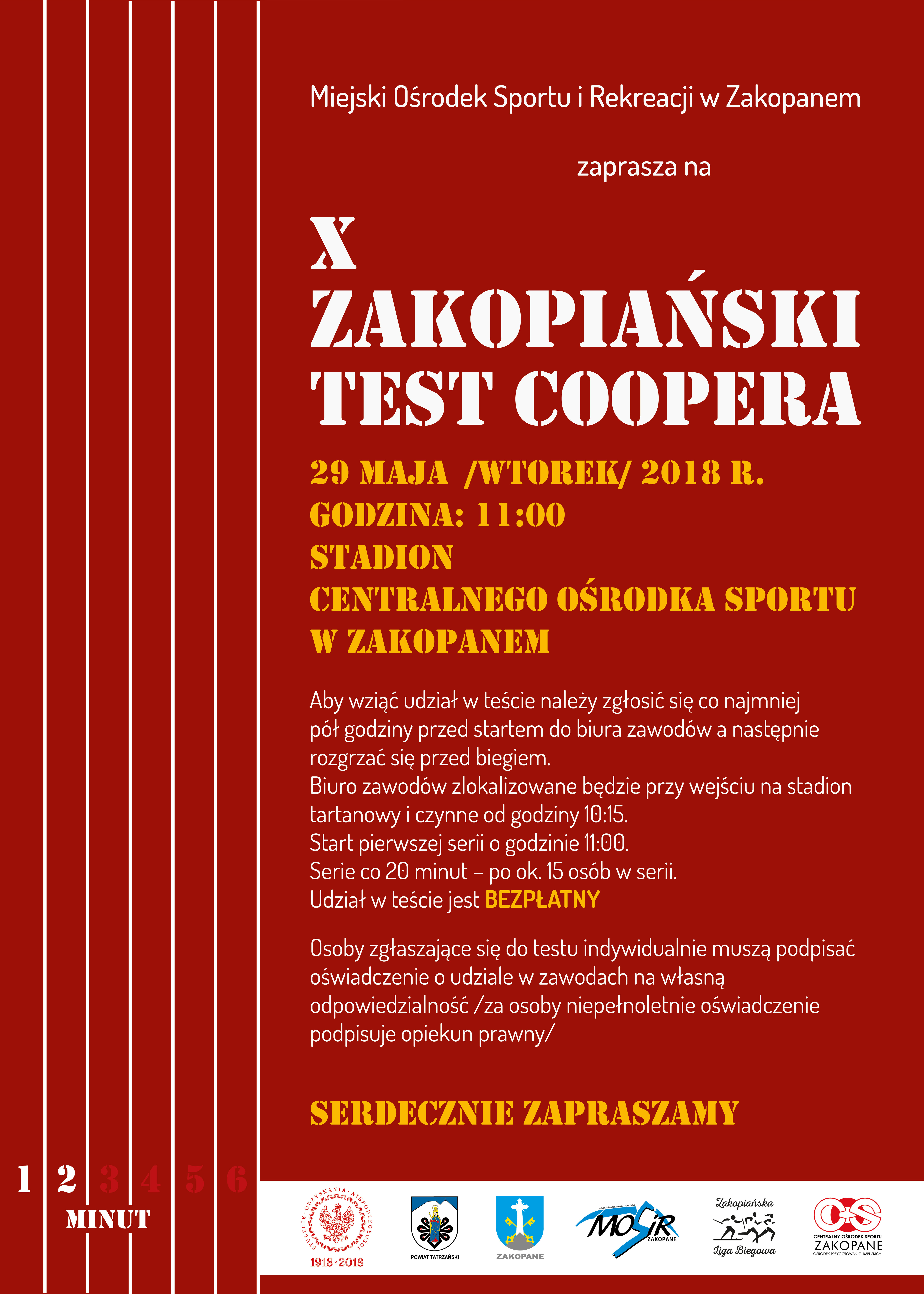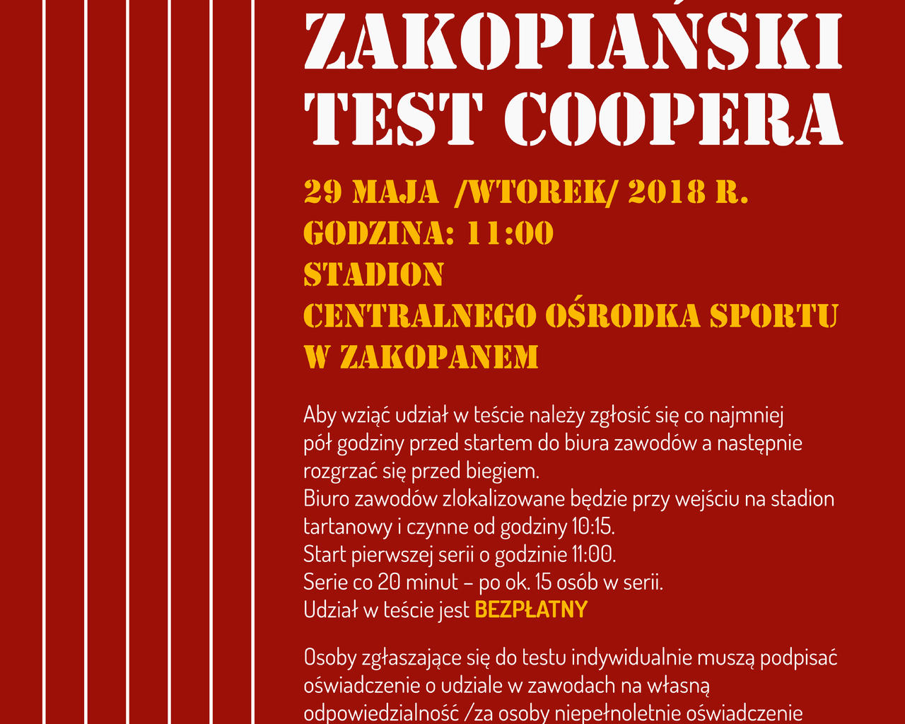 Miejski Ośrodek Sportu i Rekreacji w Zakopanem zapraszam na X Zakopiański Test Coopera, który odbędzie się 29 maja 2018 o godzinie 11:00 na Stadionie Lekkoatletycznym COS.