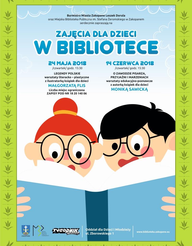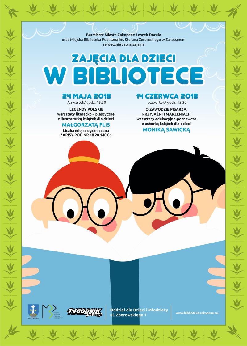 Burmistrz Miasta Zakopane Leszek Dorula oraz Miejska Biblioteka Publiczna im. Stefana Żeromskiego w Zakopanem serdecznie zapraszają na zajęcia dla dzieci w Bibliotece 24 maja i 14 czerwca.