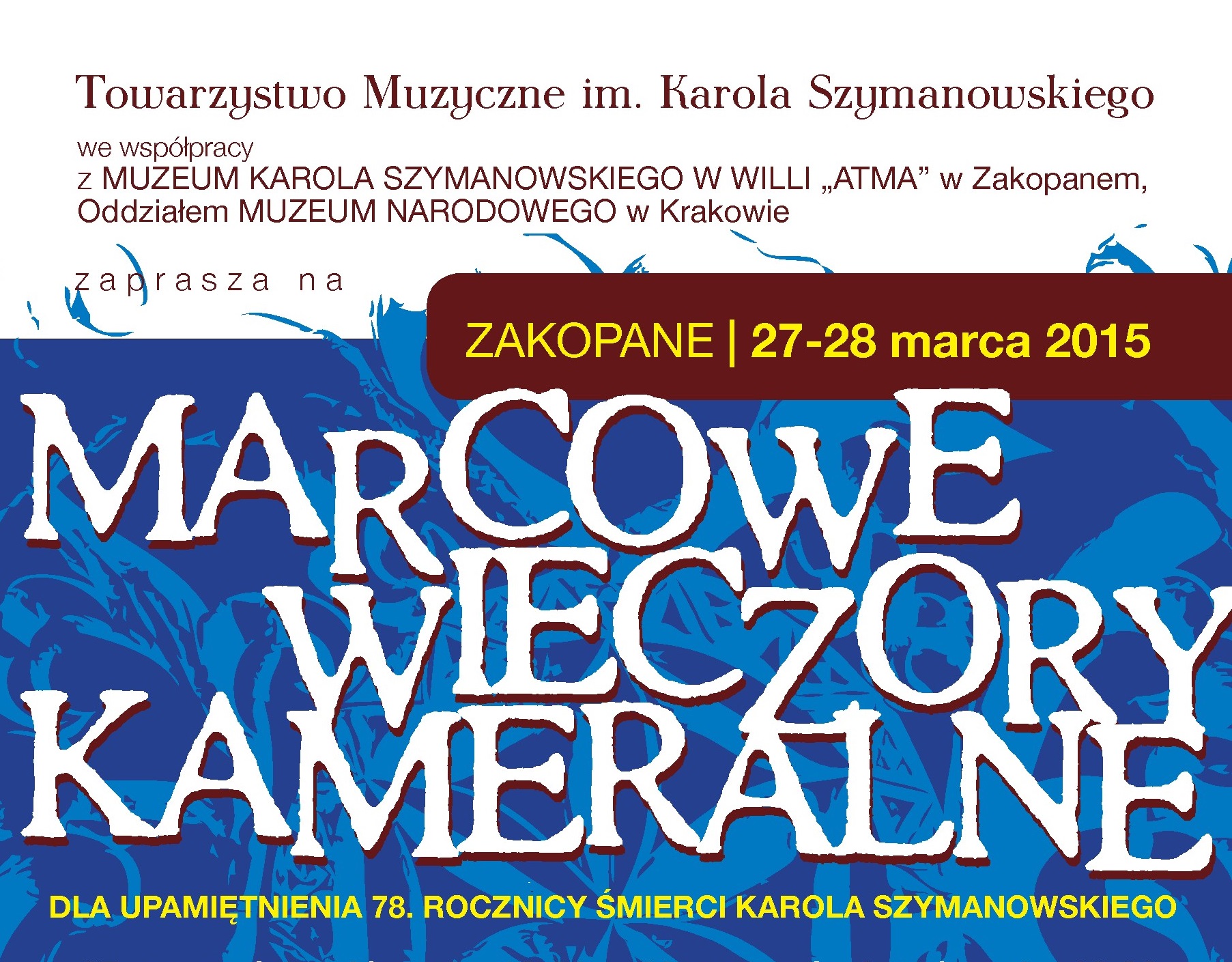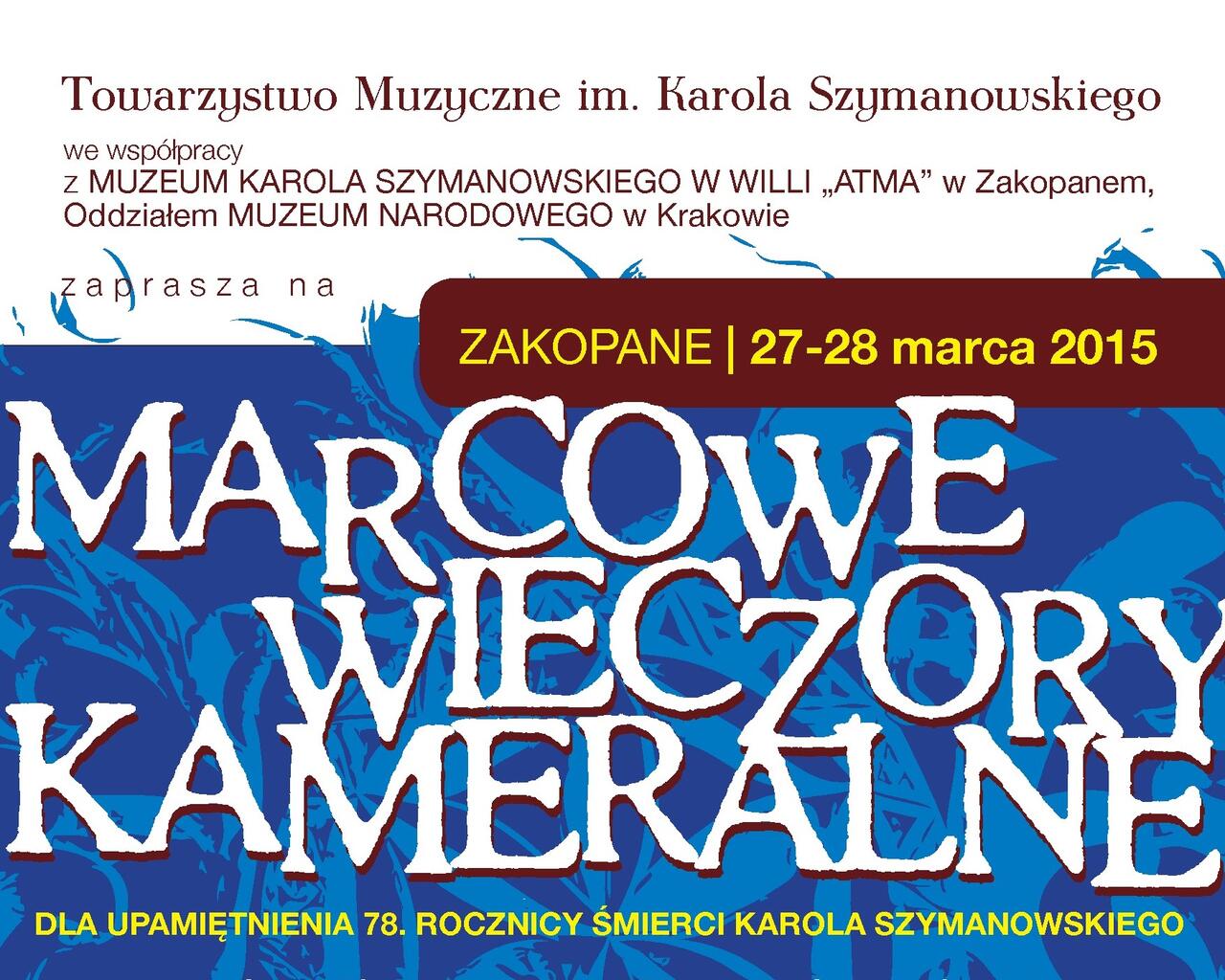 Towarzystwo Muzyczne im. Karola Szymanowskiego we współpracy z Muzeum Karola Szymanowskiego w Willi „Atma” w Zakopanem, oddziałem Muzeum Narodowego w Krakowie zapraszają na Marcowe Wieczory Kameralne, które odbędą się 27-28 marca 2015 r. Celem wydarzenia jest upamiętnienie 78. rocznicy śmierci Karola Szymanowskiego. Impreza dofinansowana została ze środków Urzędu Miasta Zakopane.