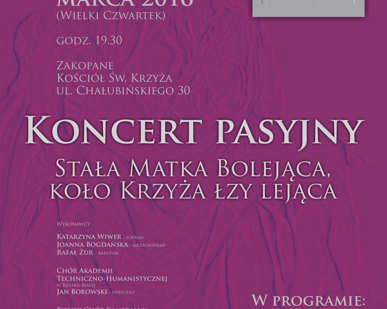 Koncert odbędzie się w Wielki Czwartek w kościele Świętego Krzyża w Zakopanem, po Nabożeństwie Wielkoczwartkowym. W programie Stabat Mater Karola Szymanowskiego poprzedzona kilkoma utworami chóralnymi wykonanymi przez Chór ATH i Bielski Chór Kameralny.