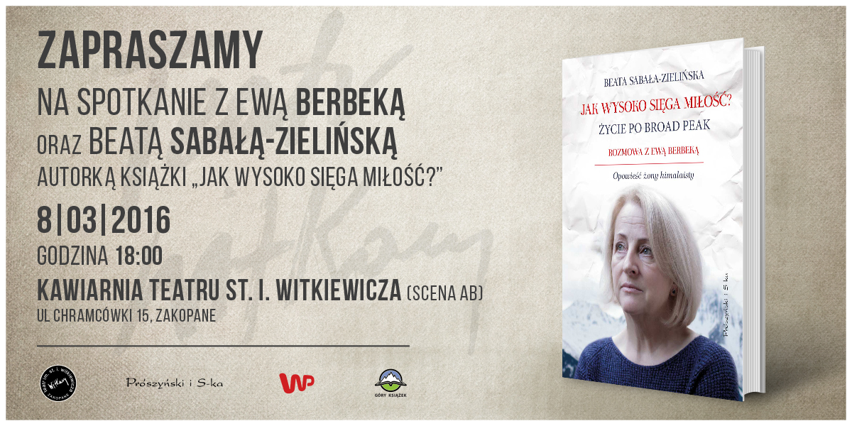 Zapraszamy na promocję książki Beaty Sabały-Zielińskiej "Jak wysoko sięga miłość. Życie po Broad Peak. Rozmowa z Ewą Berbeką", która odbędzie się 8 marca o godzinie 18.00 w kawiarni Teatru Witkacego mieszczącej się przy ul. Chramcówki 15.
