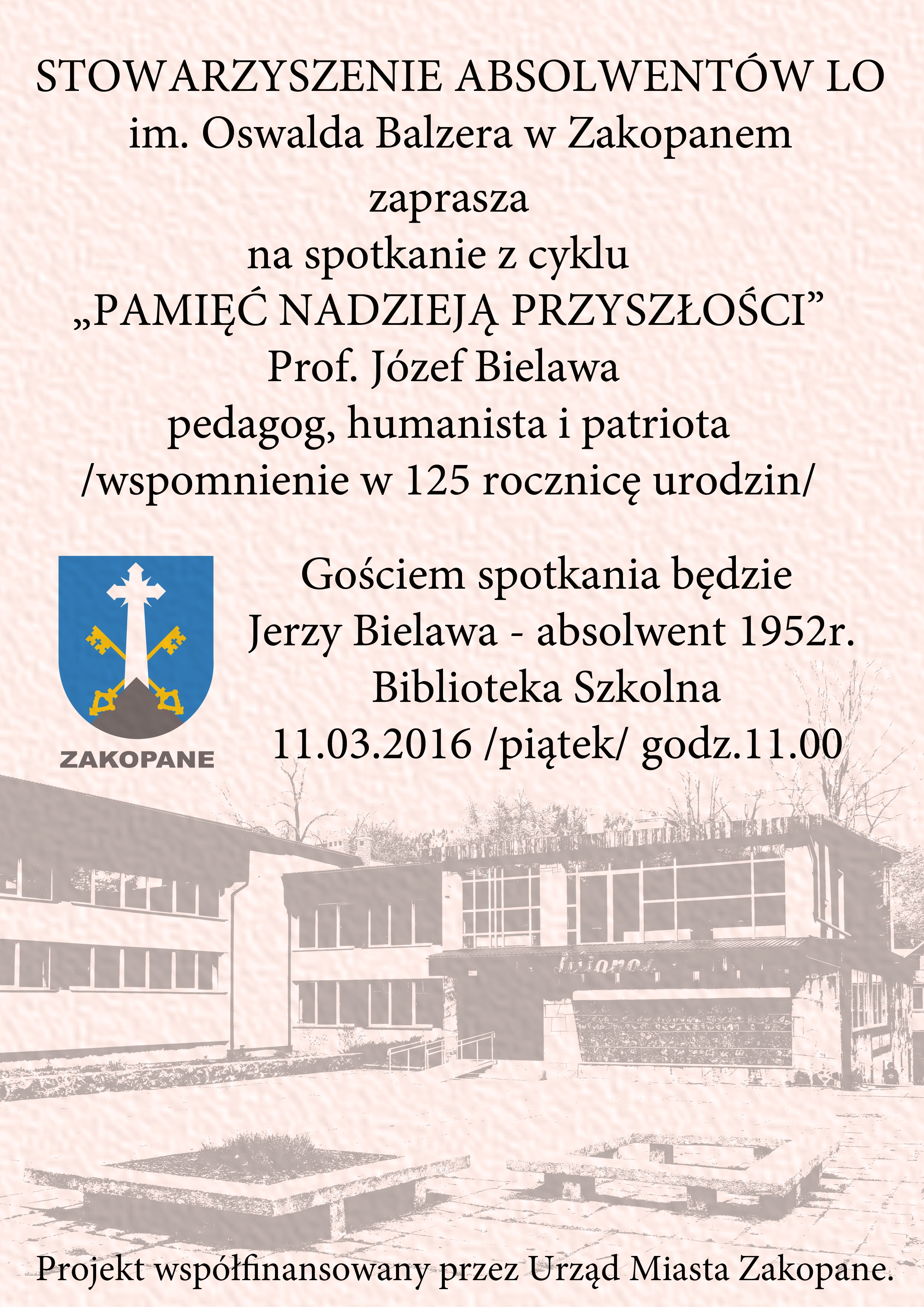 Stowarzyszenie Absolwentów Liceum Ogólnokształcącego im. Oswalda Balzera w Zakopanem zaprasza na spotkanie z cyklu "Pamięć nadzieją przyszłości". Będzie to wspomnienie o wybitnym patriocie, humaniście i pedagogu prof. Józefie Bielawie.