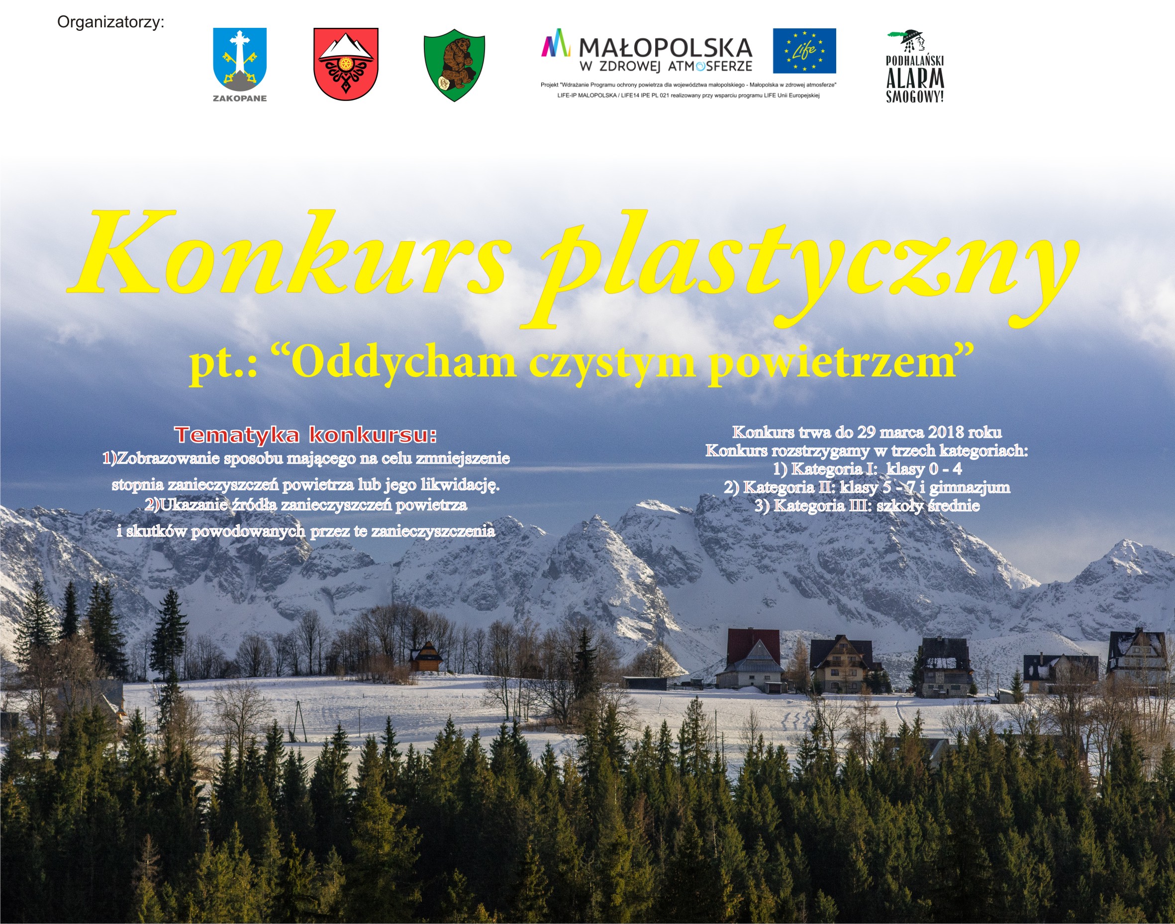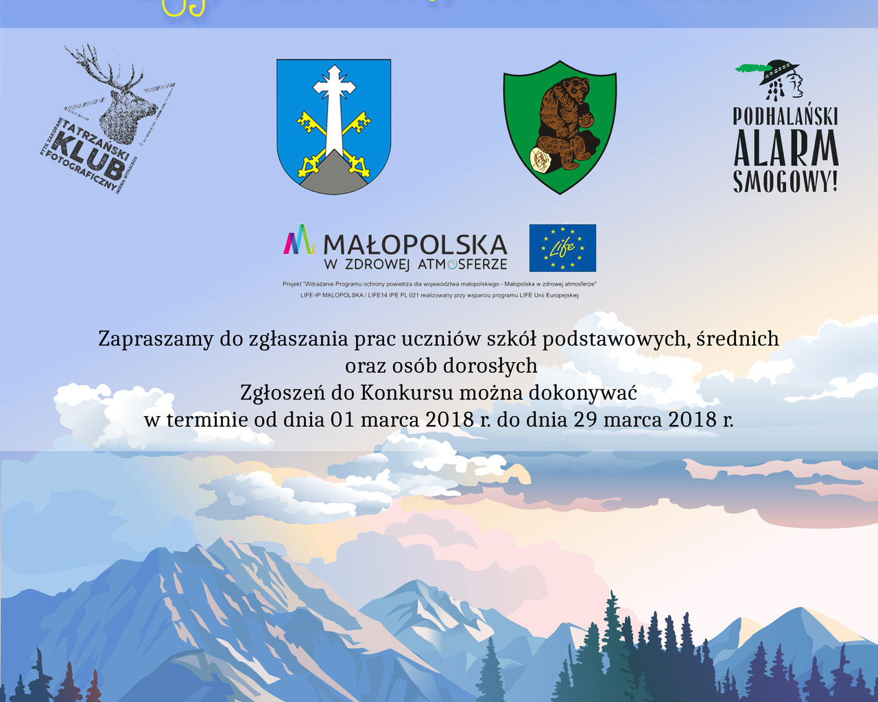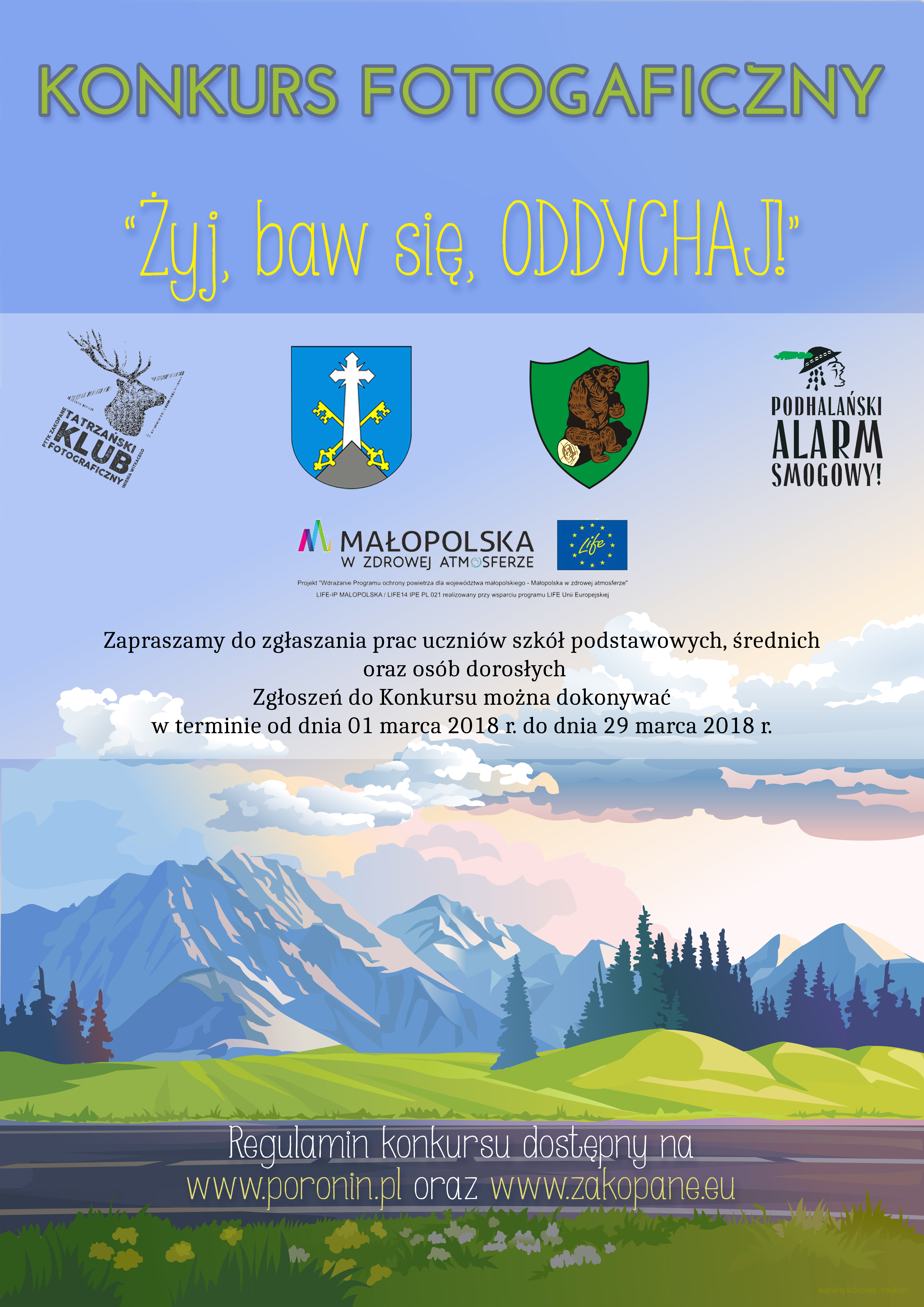 Zapraszamy do udziału w ekologicznych konkursach - plastycznym „Oddycham czystym powietrzem” oraz fotograficznym "Żyj, baw się, ODDYCHAJ", które dedykowane są dla uczniów szkół podstawowych, gimnazjalnych oraz średnich znajdujących się na terenie Gminy Bukowina Tatrzańska, Gminy Poronin oraz Miasta Zakopane.