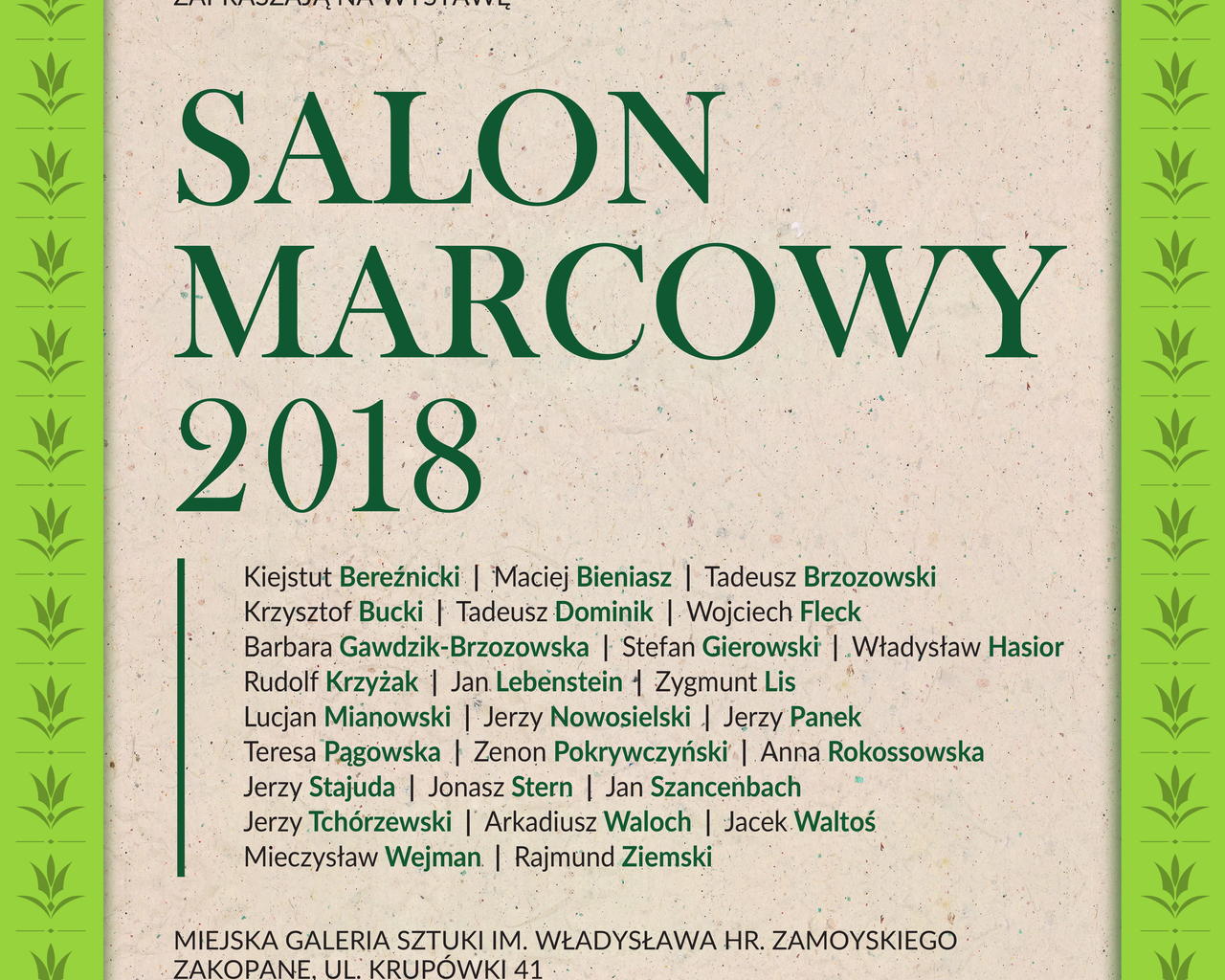 Burmistrz Miasta Zakopane Leszek Dorula, Zakopiańskie Centrum Kultury oraz Miejska Galeria Sztuki im. Władysława hr. Zamoyskiego zapraszają na wernisaż wystawy "Salon Marcowy 2018" w piątek 23 marca o godz. 17:00. Wystawa czynna do 6 maja.