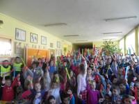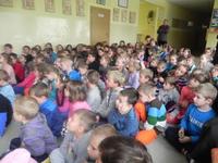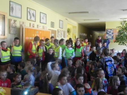 Dzisiejszy apel podsumował tematykę bezpieczeństwa pieszego poza terenem zabudowanym prezentacją multimedialną. Wszyscy uczniowie otrzymali elementy odblaskowe, a starsze klasy również kamizelki.