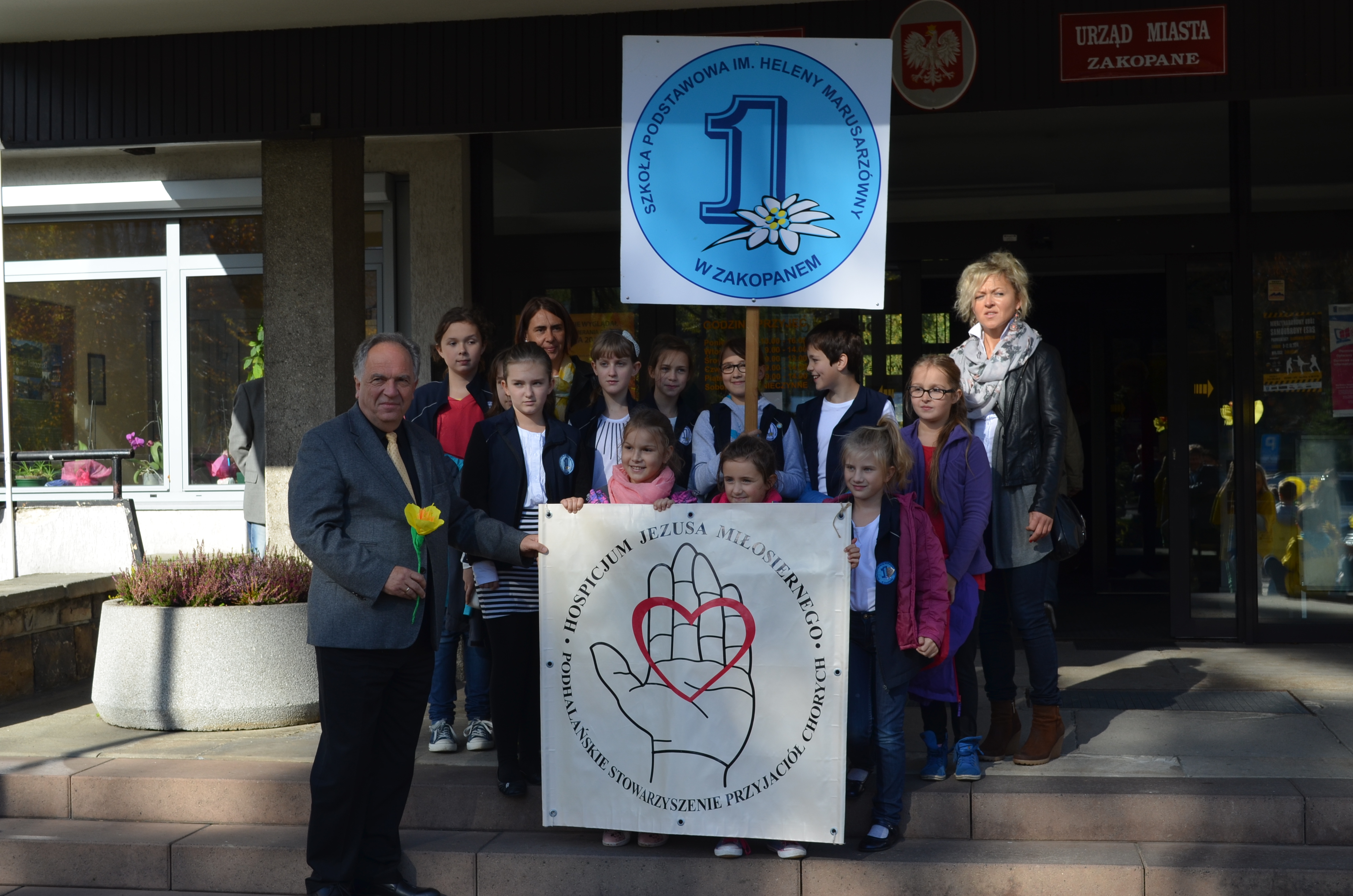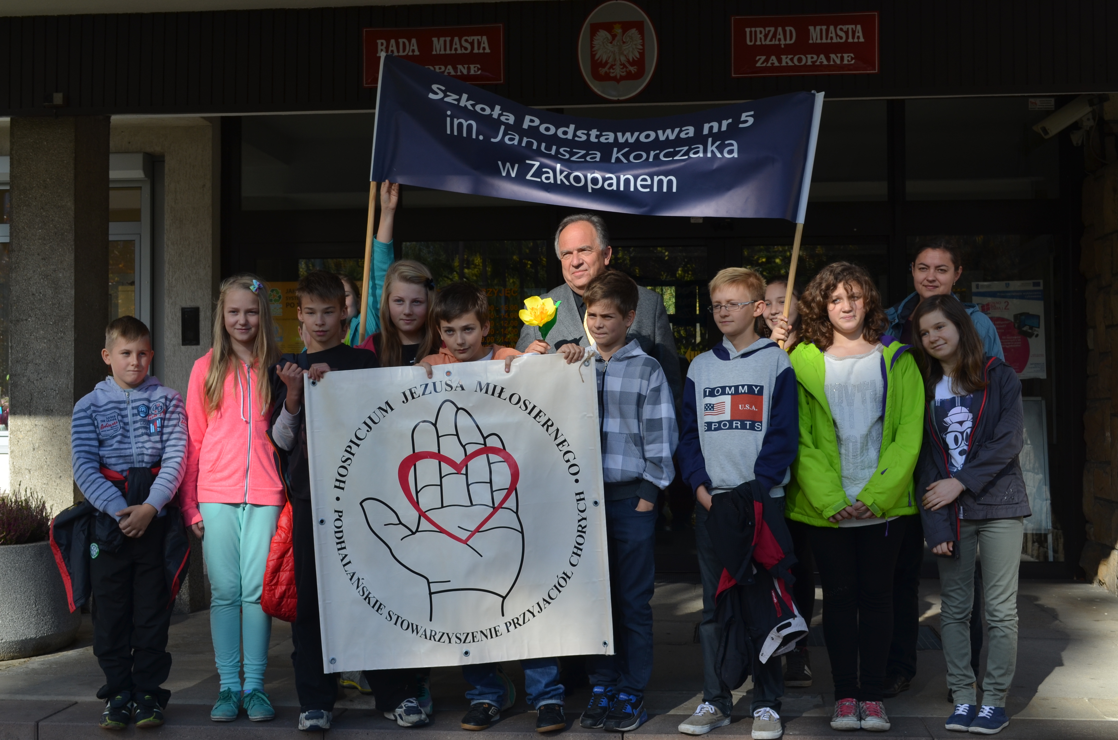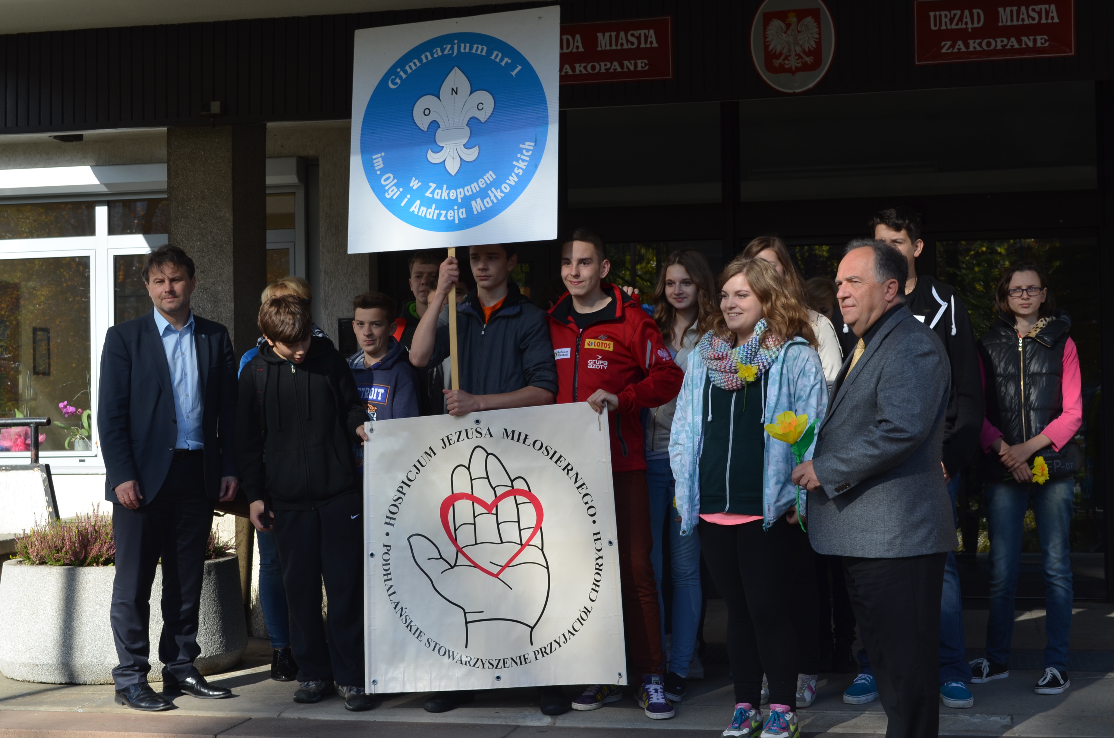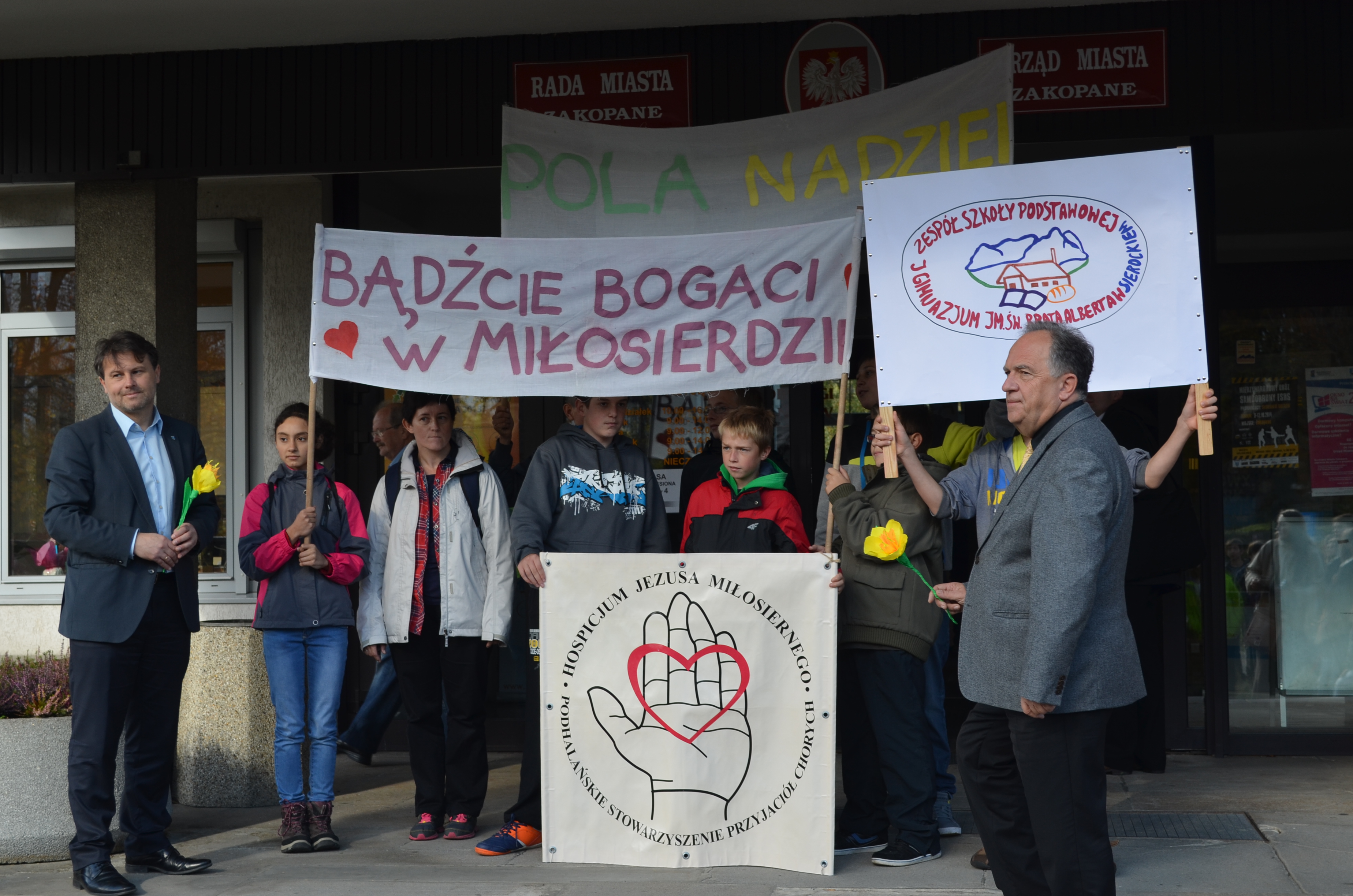 Uczestnicy akcji „Pola nadziei”, w trakcie przemarszu ulicami miasta, odwiedzili Urząd Miasta Zakopane, gdzie spotykali się z burmistrzem Januszem Majchrem i jego zastępcą Mariuszem Koperskim. Akcja, w którą od lat włącza się młodzież i dzieci z terenu Skalnego Podhala, ma na celu poszukiwanie środków finansowych na rzecz osób terminalnie chorych.