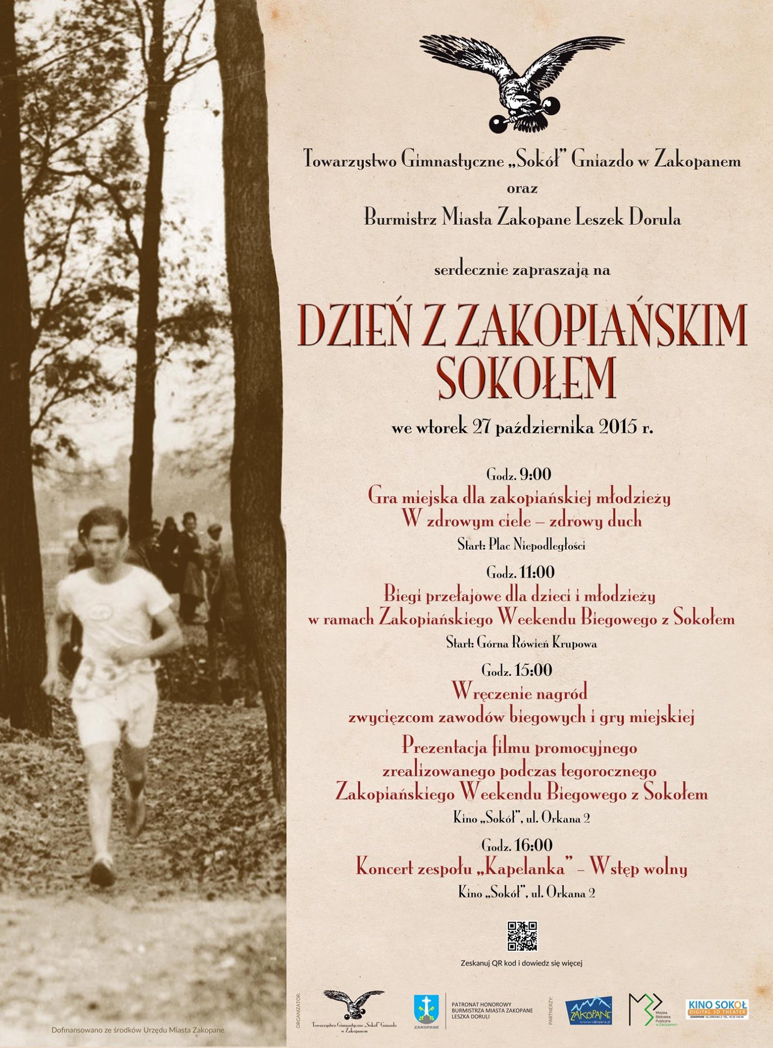 Towarzystwo Gimnastyczne „Sokół” Gniazdo w Zakopanem oraz Burmistrz Miasta Zakopane Leszek Dorula serdecznie zapraszają na DZIEŃ Z ZAKOPIAŃSKIM SOKOŁEM we wtorek 27 października 2015 r.