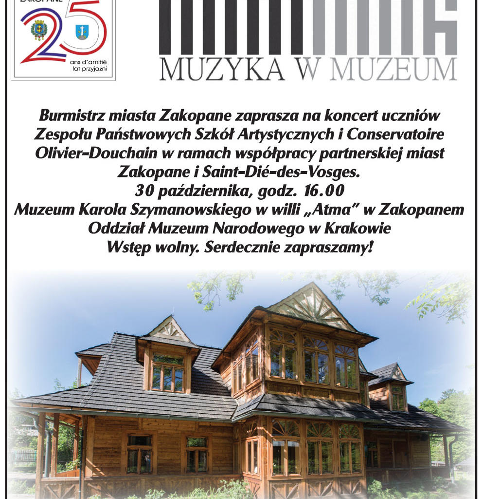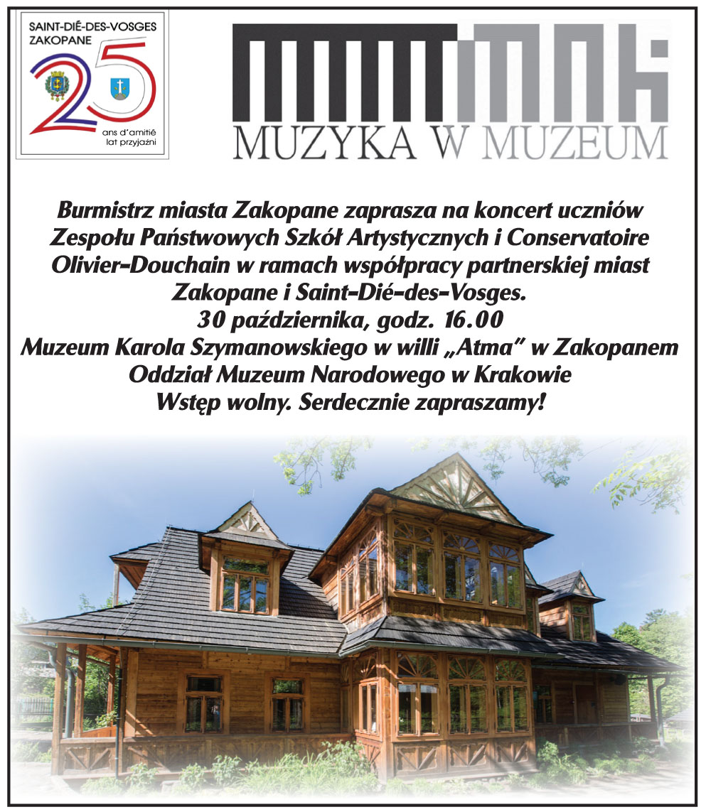 Burmistrz Miasta Zakopane Leszek Dorula zaprasza na koncert uczniów Zespołu Państwowych Szkół Artystycznych i Conservatoire Olivier-Douchain w ramach współpracy partnerskiej miast Zakopane i Saint-Dié-des-Vosges 30 października 2015 o godz. 16.00. Muzeum Karola Szymanowskiego w willi „Atma” w Zakopanem, Oddział Muzeum Narodowego w Krakowie.