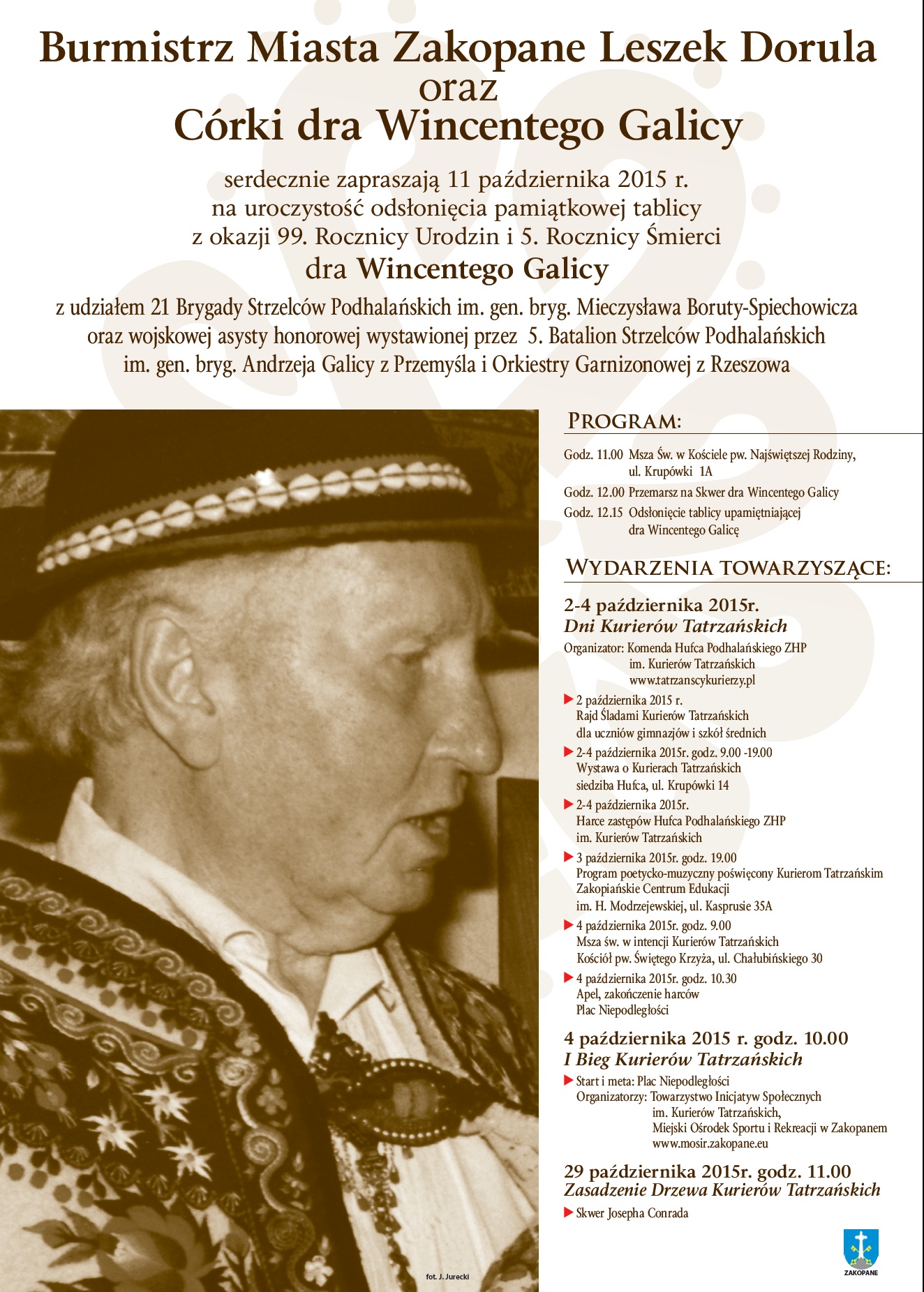 Burmistrz Miasta Zakopane Leszek Dorula oraz Córki dra Wincentego Galicy serdecznie zapraszają 11 października 2015 r. na uroczystość odsłonięcia pamiątkowej tablicy z okazji 99. Rocznicy Urodzin i 5. Rocznicy Śmierci dra Wincentego Galicy z udziałem 21 Brygady Strzelców Podhalańskich im. gen. bryg. Mieczysława Boruty-Spiechowicza oraz wojskowej asysty honorowej wystawionej przez 5. Batalion Strzelców Podhalańskich im. gen. bryg. Andrzeja Galicy z Przemyśla i Orkiestry Garnizonowej z Rzeszowa.