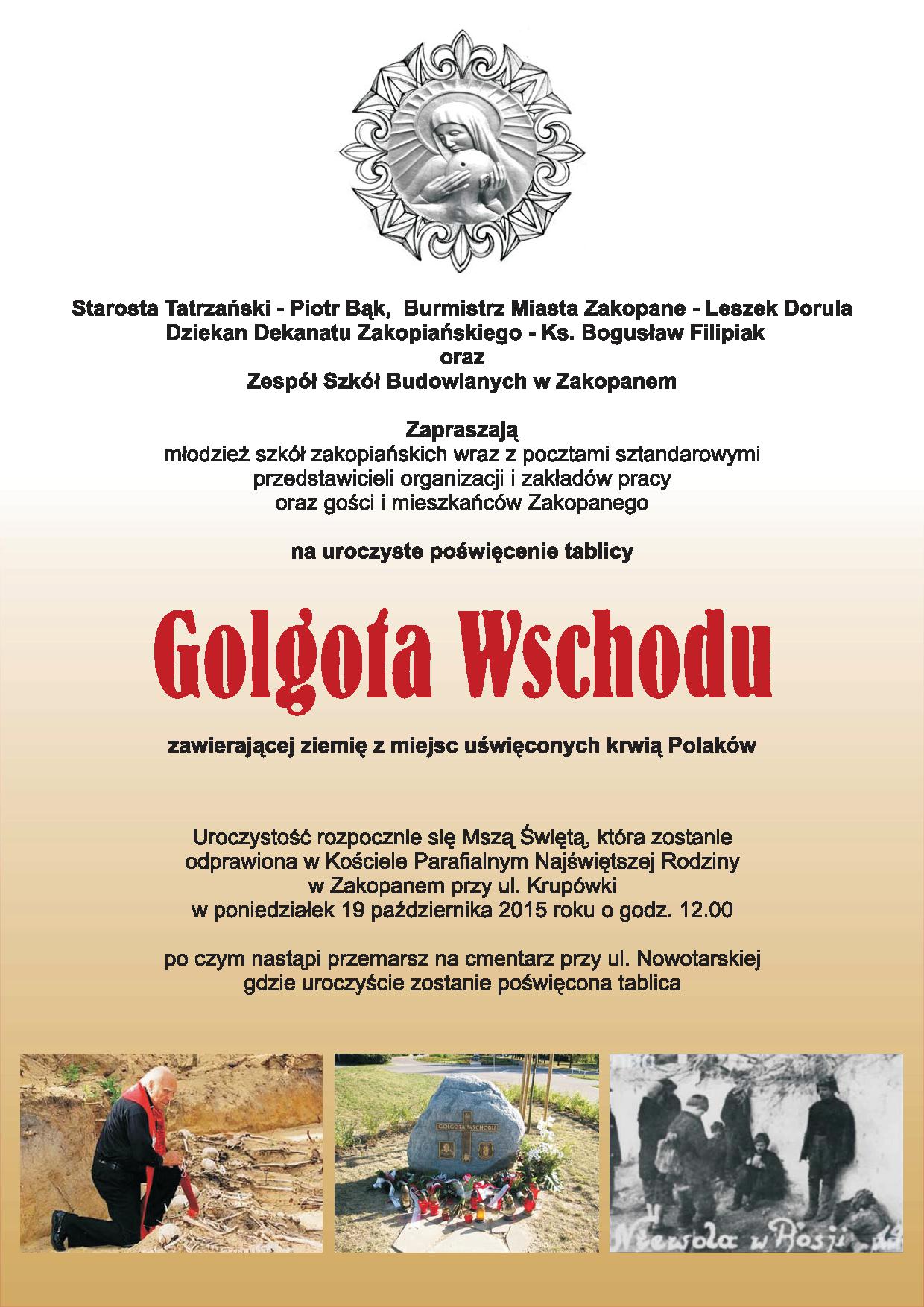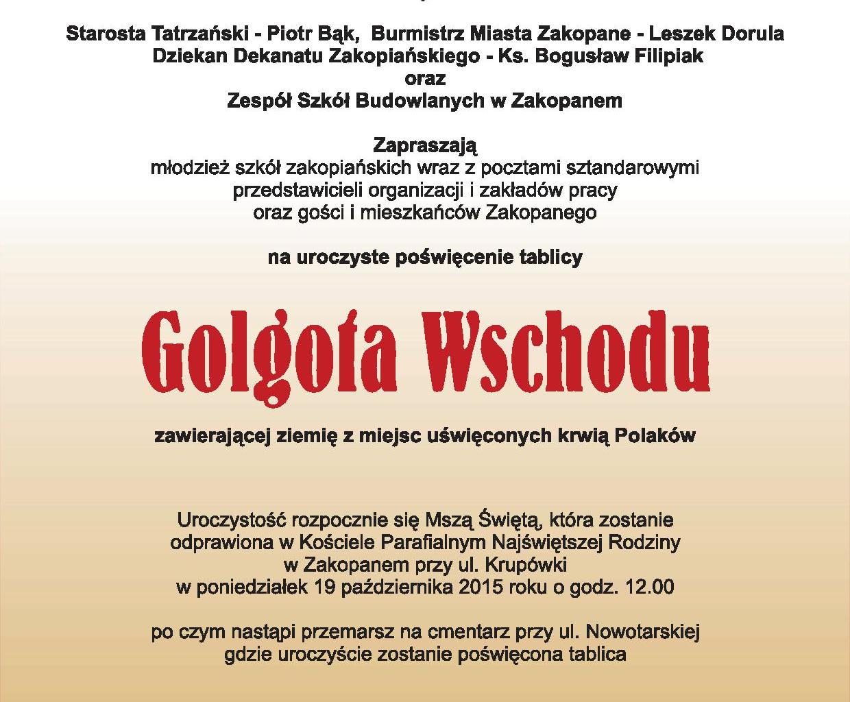 Starosta Tatrzański Piotr Bąk, Burmistrz Miasta Zakopane Leszek Dorula, Dziekan Dekanatu Zakopiańskiego ks. Bogusław Filipiak i Zespół Szkół Budowlanych w Zakopanem zapraszają na uroczyste poświęcenie tablicy Golgota Wschodu zawierającej ziemię z miejsc uświęconych krwią Polaków.