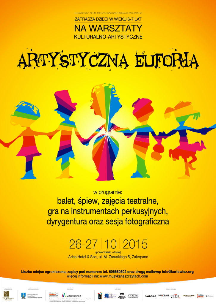 Stowarzyszenie im. Mieczysława Karłowicza w Zakopanem zaprasza dzieci w wieku 6 i 7 lat na warsztaty kulturalno-artystyczne pt. ARTYSTYCZNA EUFORIA, które odbędą się w dniach 26-27.10.2015 r. w Hotelu Aries w Zakopanem pod honorowym patronatem Burmistrza Miasta Zakopane Leszka Doruli.