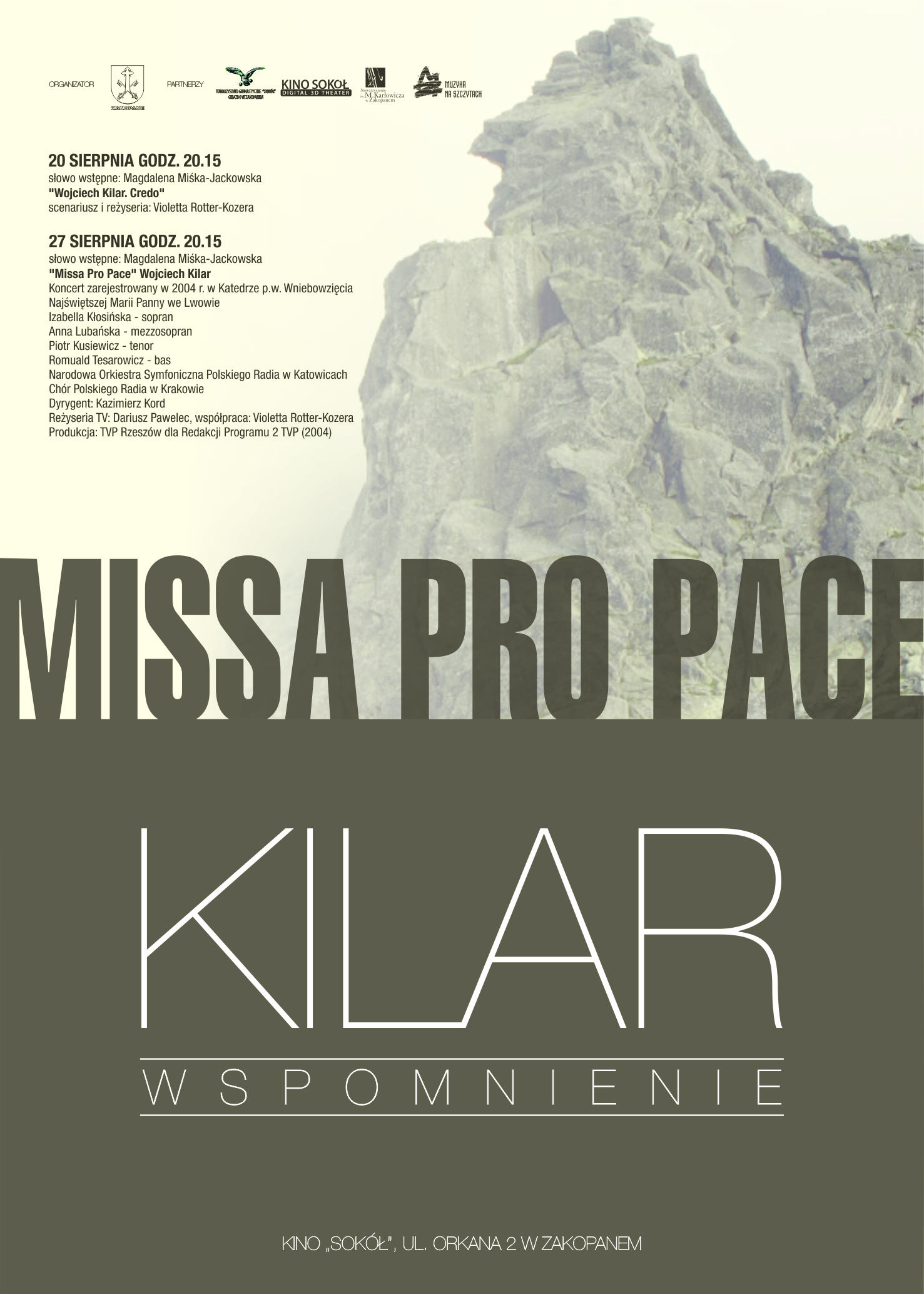 Burmistrz Miasta Zakopane zaprasza na cykl filmowy „Missa Pro Pace”/Kilar/Wspomnienie 20 i 27 sierpnia 2014 r. o godz. 20.15 w kinie „Sokół”, ul. Orkana 2 w Zakopanem.