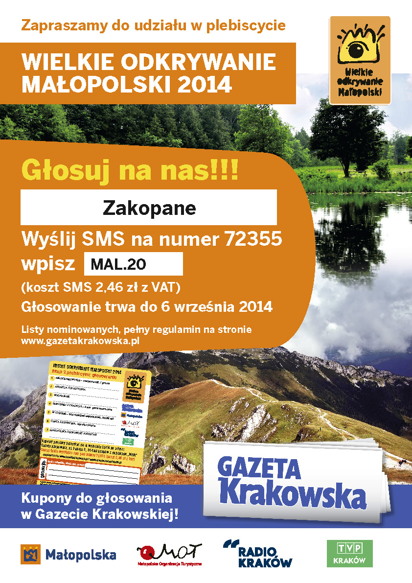 Informujemy, że Kapituła Wielkiego Odkrywania Małopolski zakwalifikowała do etapu finałowego plebiscytu w kategorii Miejsce niezwykłe - Miejscowość/Gmina - Zakopane. Zachęcamy do głosowania!
