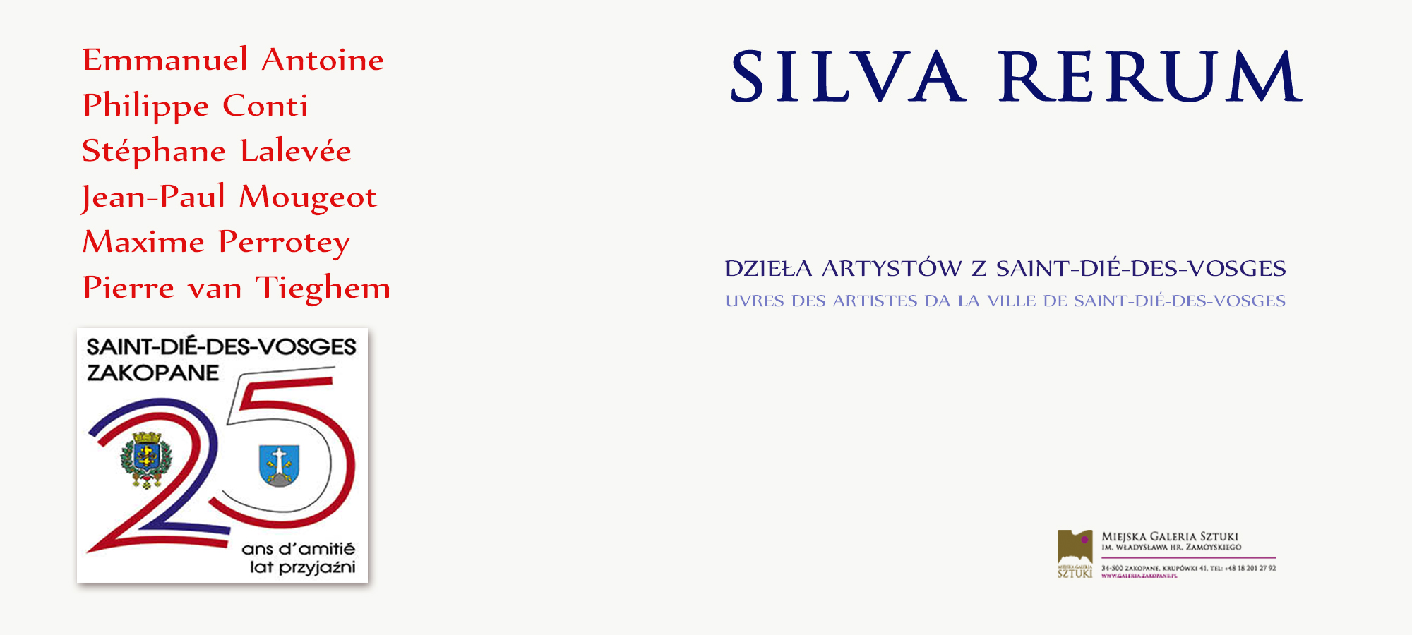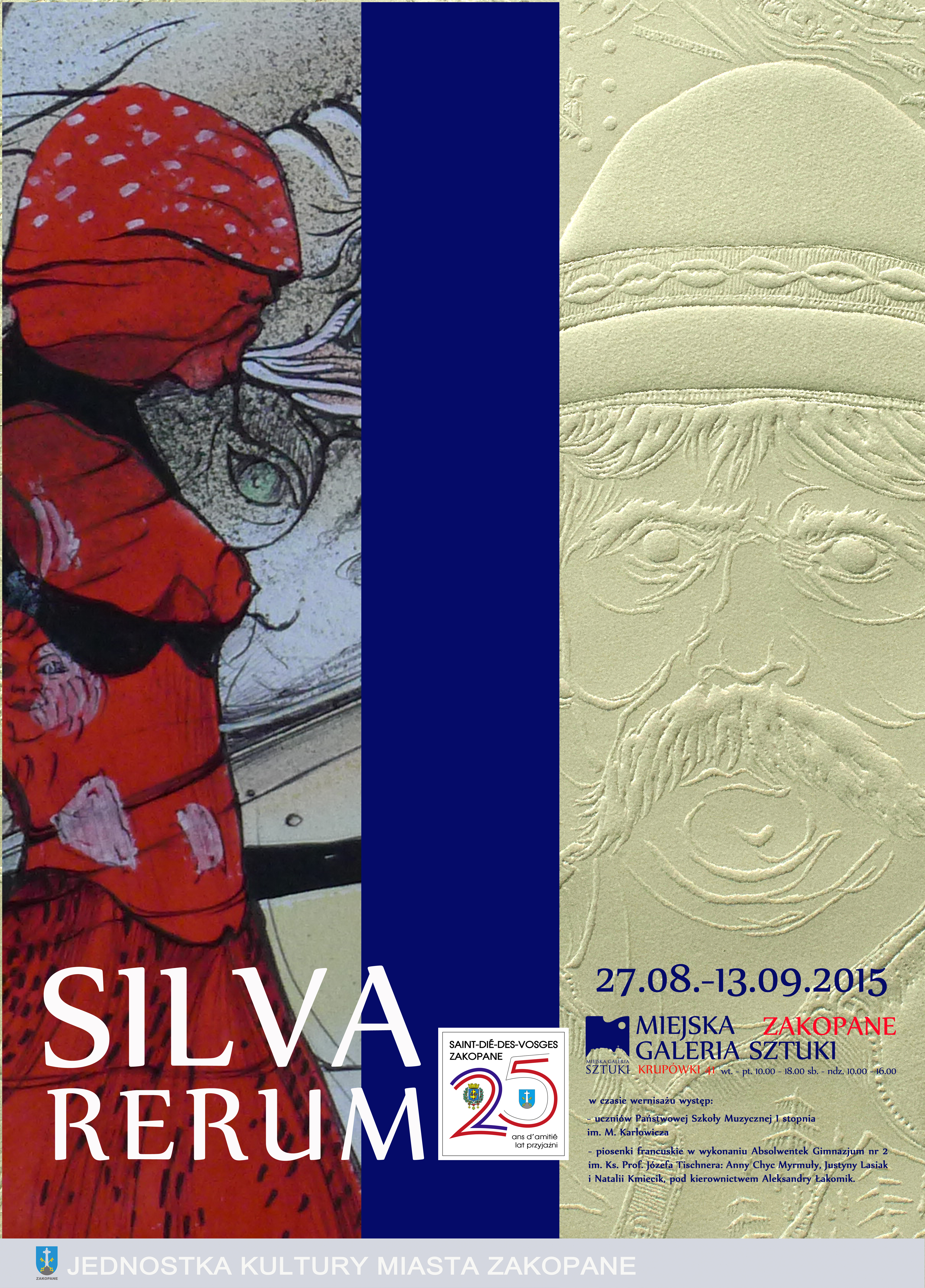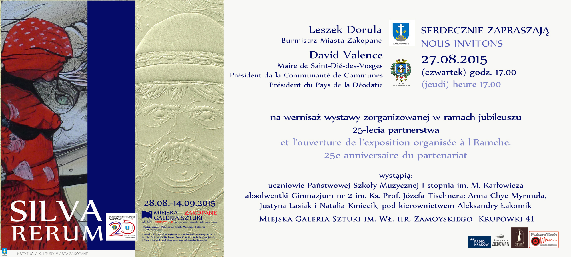 27 sierpnia (czwartek) o godz. 17.00 w Miejskiej Galerii sztuki, ul. Krupówki 41 odbędzie się wernisaż wystawy artystów francuskich. Wystąpią uczniowie Państwowej Szkoły Muzycznej I stopnia im. Mieczysława Karłowicza i absolwentki Gimnazjum Nr 2: Anna Chyc Myrmuła, Justyna Lasiak i Natalia Kmiecik pod kierownictwem Aleksandry Łakomik.