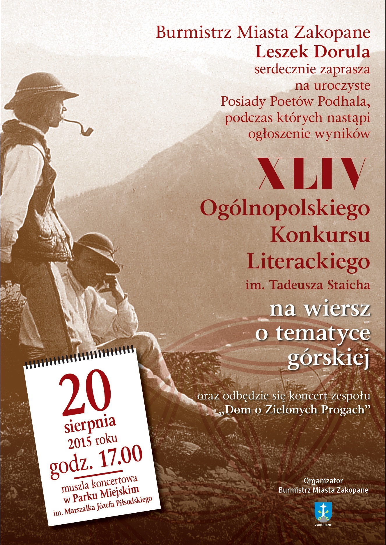 Burmistrz Miasta Zakopane Leszek Dorula serdecznie zaprasza 20 sierpnia o godz. 17.00 do muszli koncertowej w Parku Miejskim im. Marszałka Józefa Piłsudskiego na uroczyste Posiady Poetów Podhala.