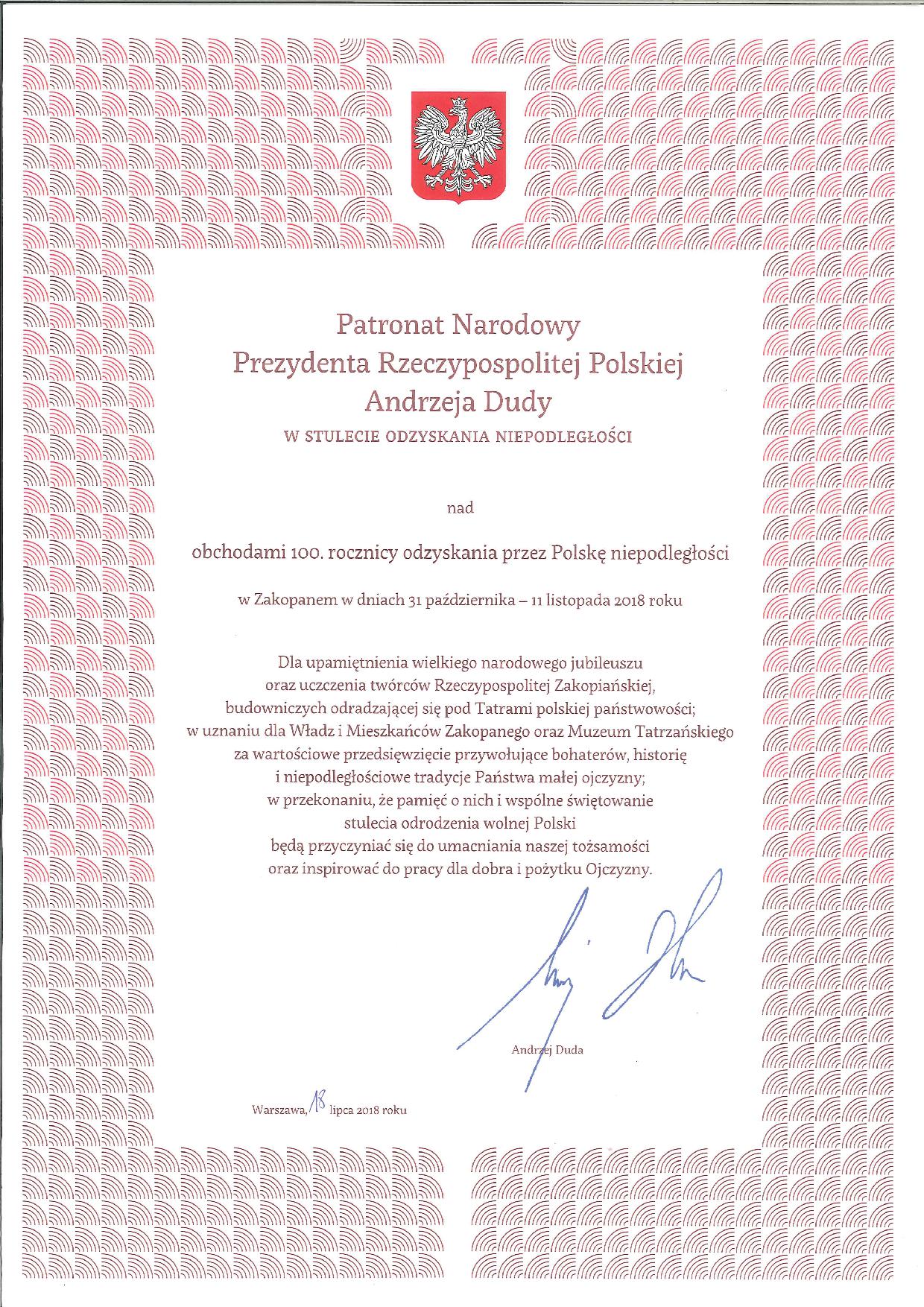 W tym roku Zakopane, tak jak cała Polska, w szczególny sposób świętować będzie 100-lecie Odzyskania Niepodległości. Obchody mają szczególny charakter także z tego względu, iż zostały objęte Patronatem Narodowym Prezydenta Rzeczypospolitej Polskiej Andrzeja Dudy w Stulecie Odzyskania Niepodległości nad obchodami 100. rocznicy odzyskania przez Polskę niepodległości w Zakopanem w dniach 31 października - 11 listopada 2018.