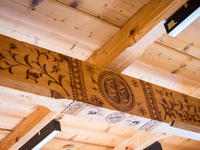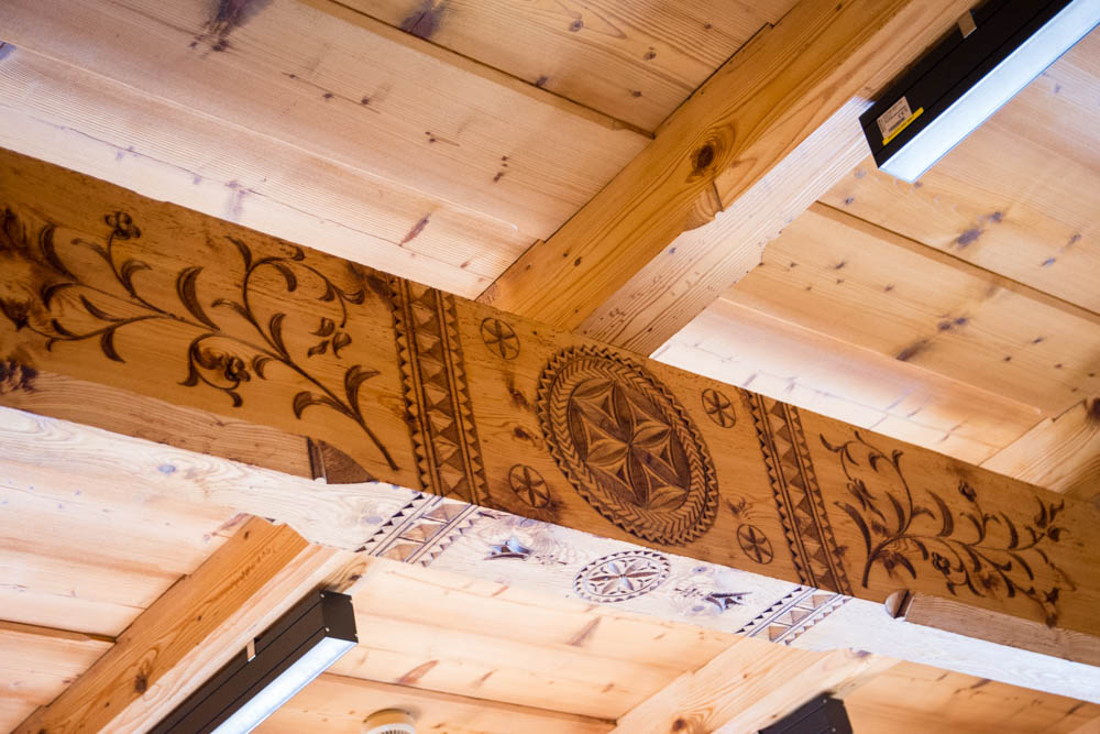 Oryginalne ściany i sufity oczyszczone zostały wykorzystując technologię piaskowania strumieniowego, przy pomocy drobnego wiślanego piasku, dzięki czemu udało się przywrócić naturalny kolor drewna i wydobyć rzeźbione zdobienia.