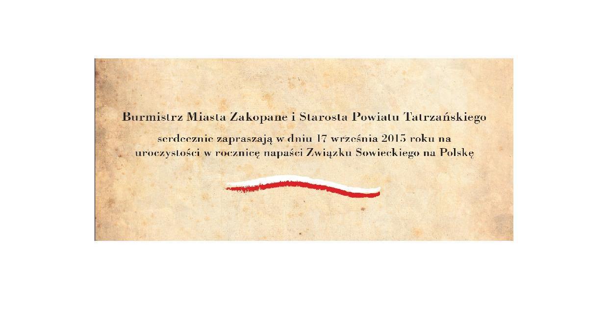 Burmistrz Miasta Zakopane Leszek Dorula i Starosta Powiatu Tatrzańskiego Piotr Bąk serdecznie zapraszają w dniu 17 września 2015 roku na uroczystości w rocznicę napaści Związku Sowieckiego na Polskę.