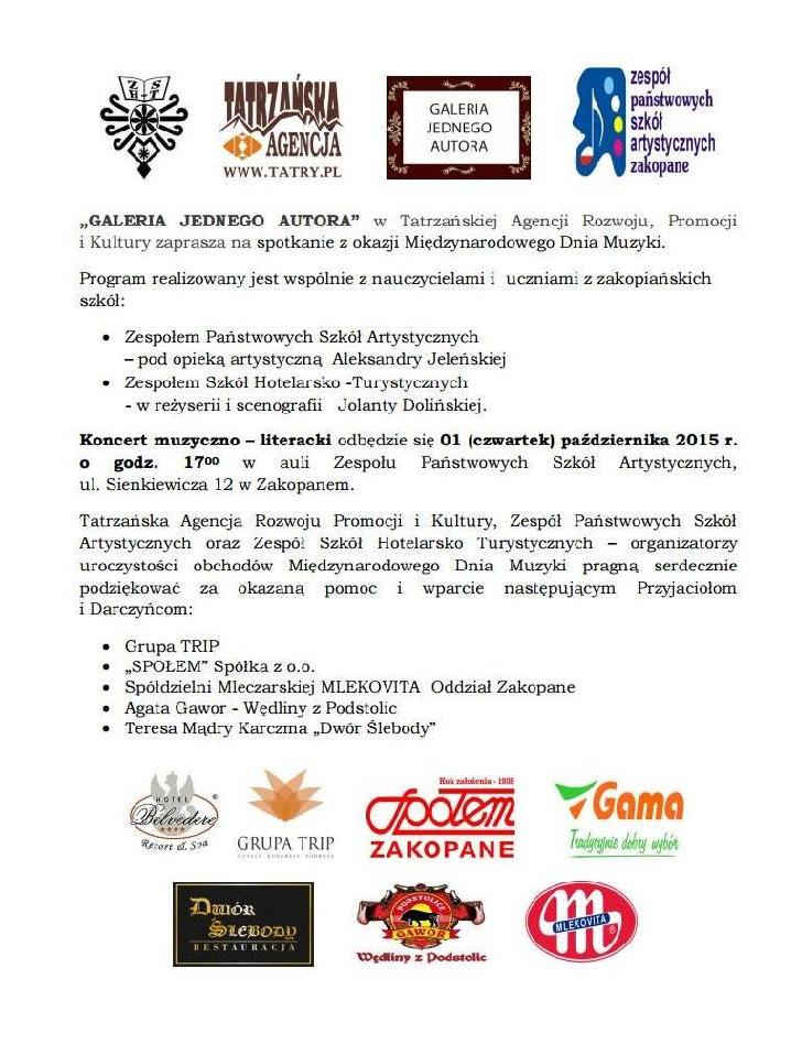 Tatrzańska Agencja Rozwoju Promocji i Kultury, Zespół Państwowych Szkół Artystycznych oraz Zespół Szkół Hotelarsko Turystycznych – organizatorzy uroczystości obchodów Międzynarodowego Dnia Muzyki pragną serdecznie podziękować za okazaną pomoc i wparcie następującym Przyjaciołom i Darczyńcom: