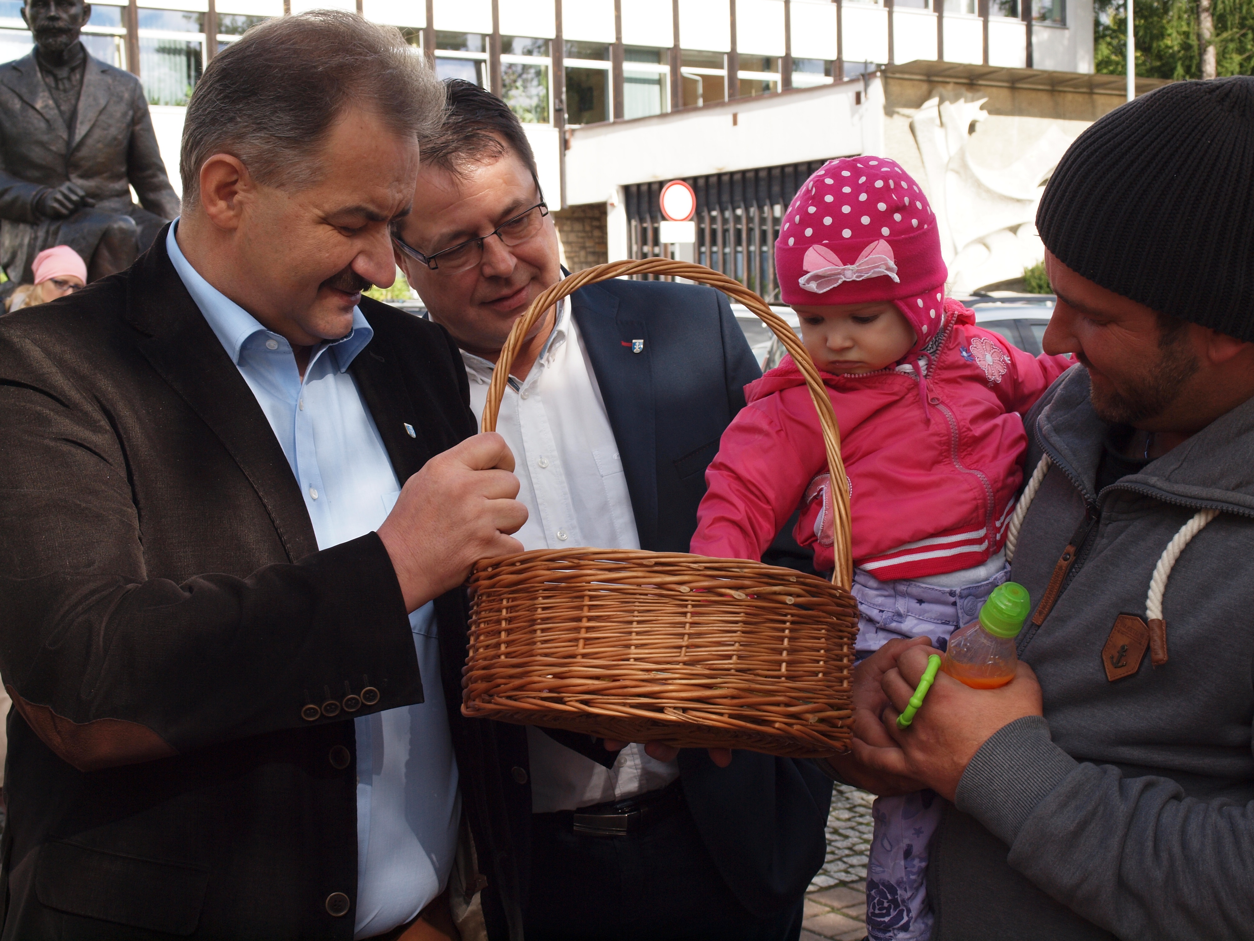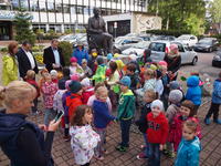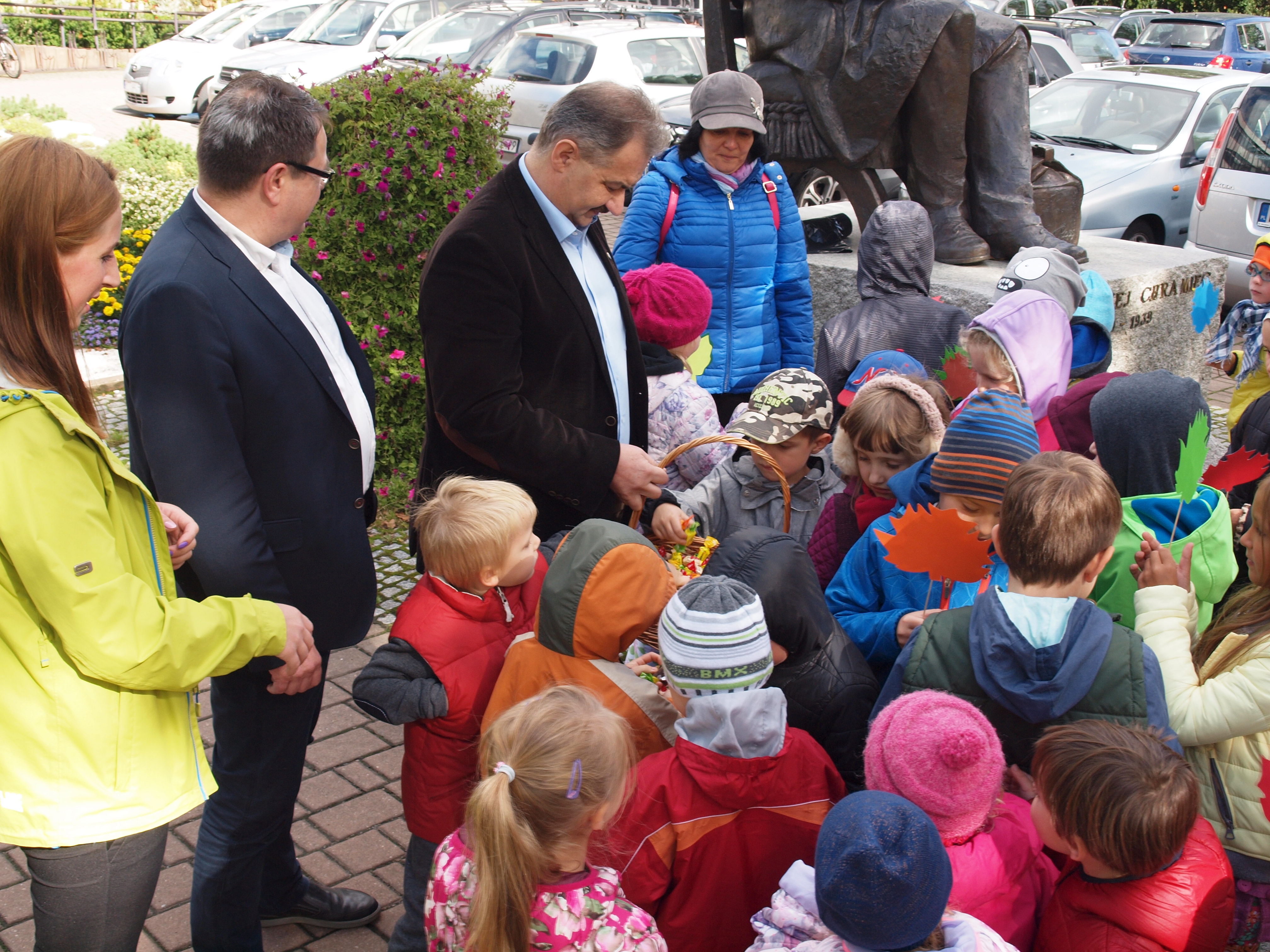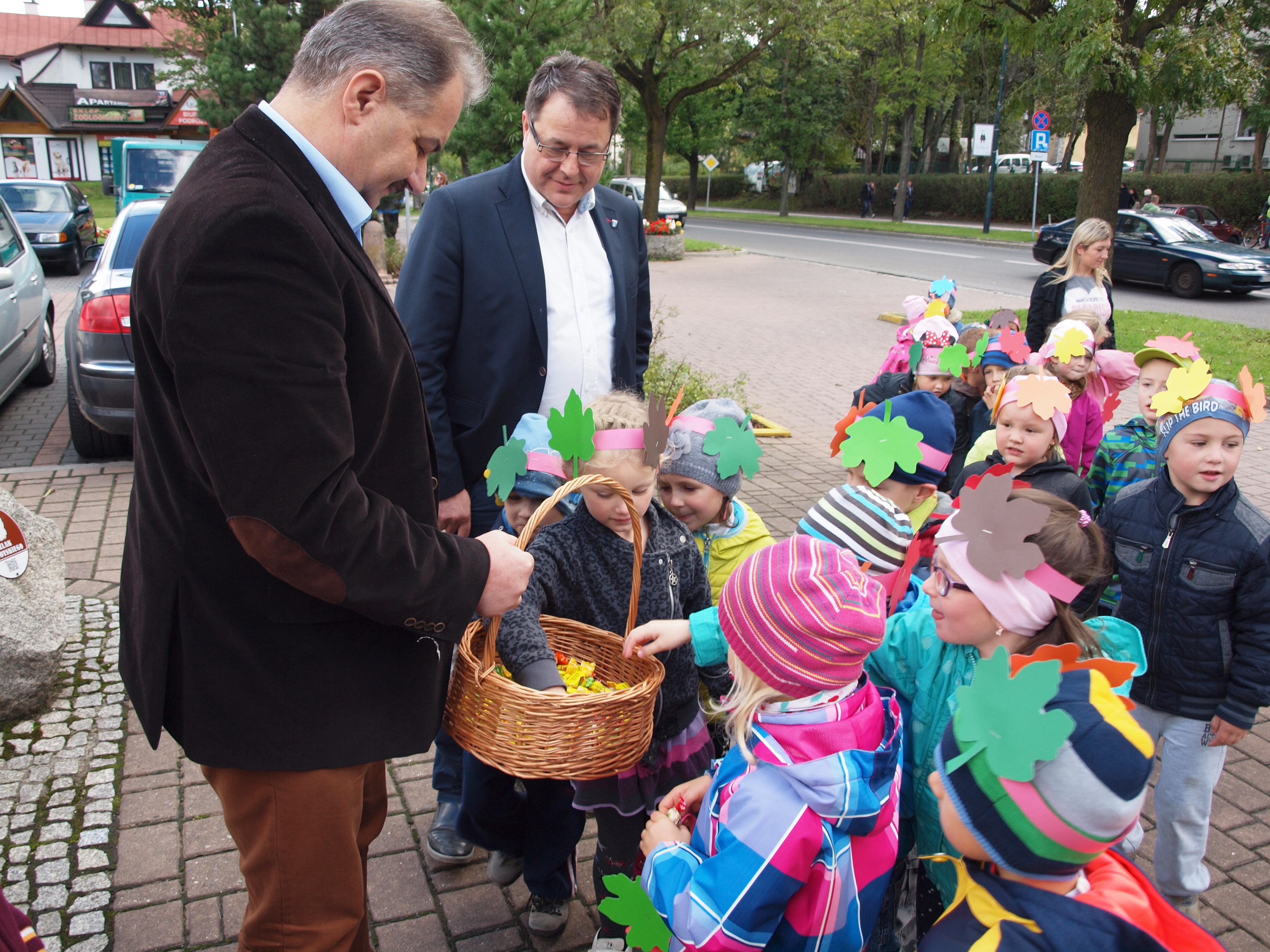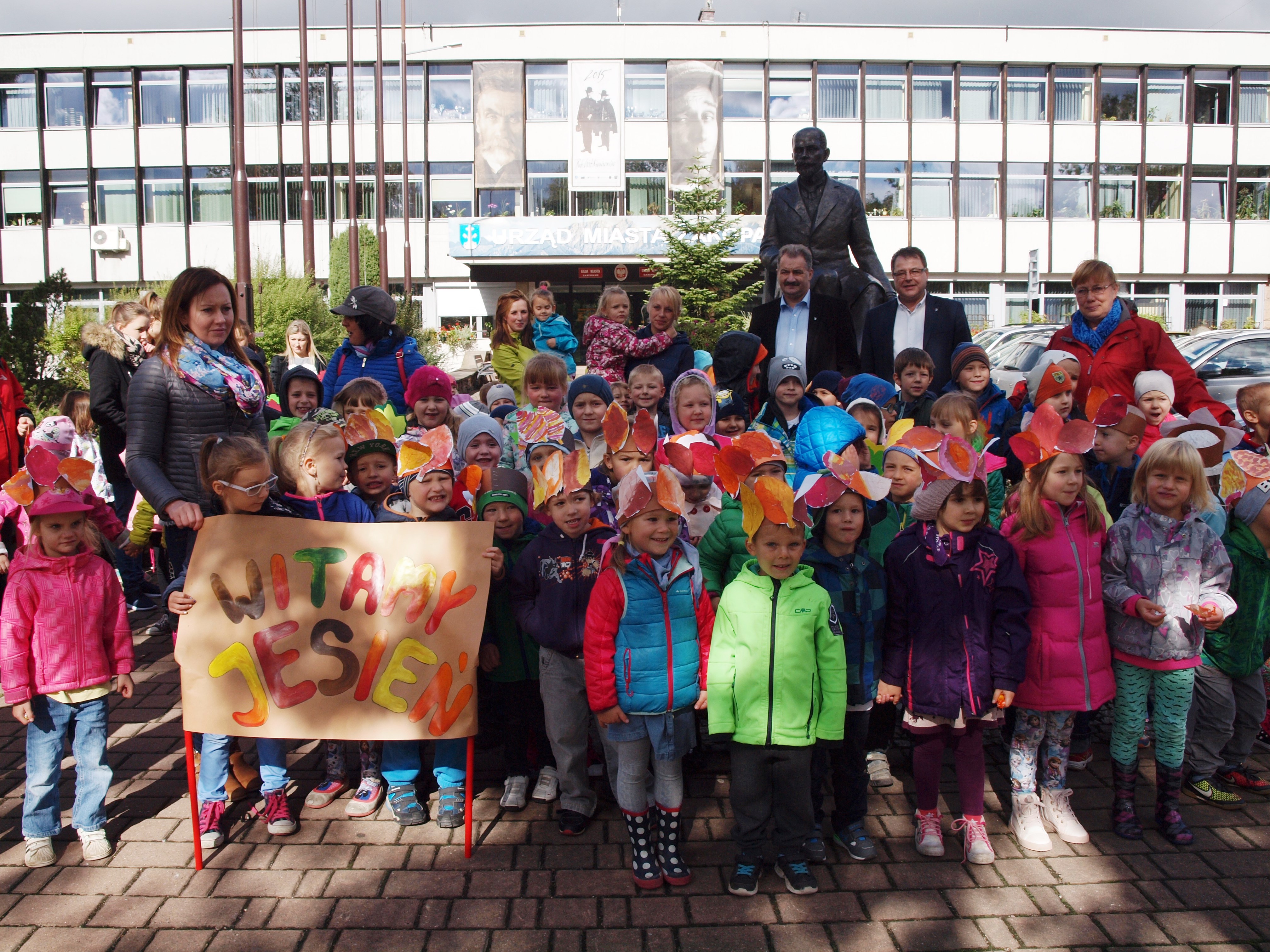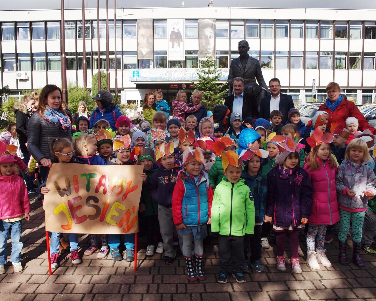 Burmistrzowie Leszek Dorula i Wiktor Łukaszczyk wraz z dziećmi z zakopiańskiego przedszkola "Kubuś Puchaty" piosenkami i słodyczami przywitali dziś jesień.