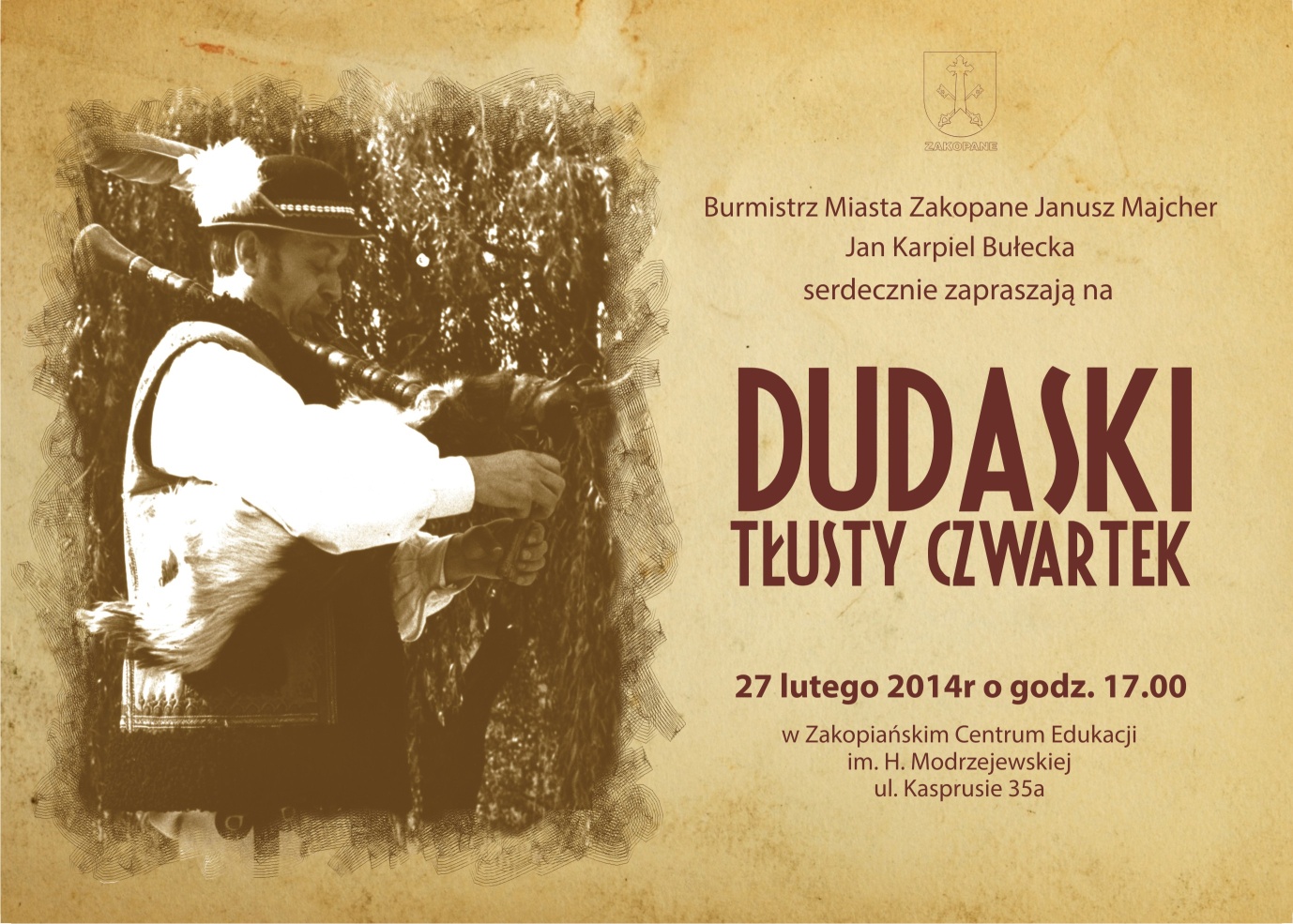 Burmistrz Miasta Zakopane Janusz Majcher i Jan Karpiel Bułecka zapraszają na „Dudaski Tłusty Czwartek", który odbędzie się 27 lutego o godz. 17.00 w Zakopiańskim Centrum Edukacji, ul. Kasprusie 35a.