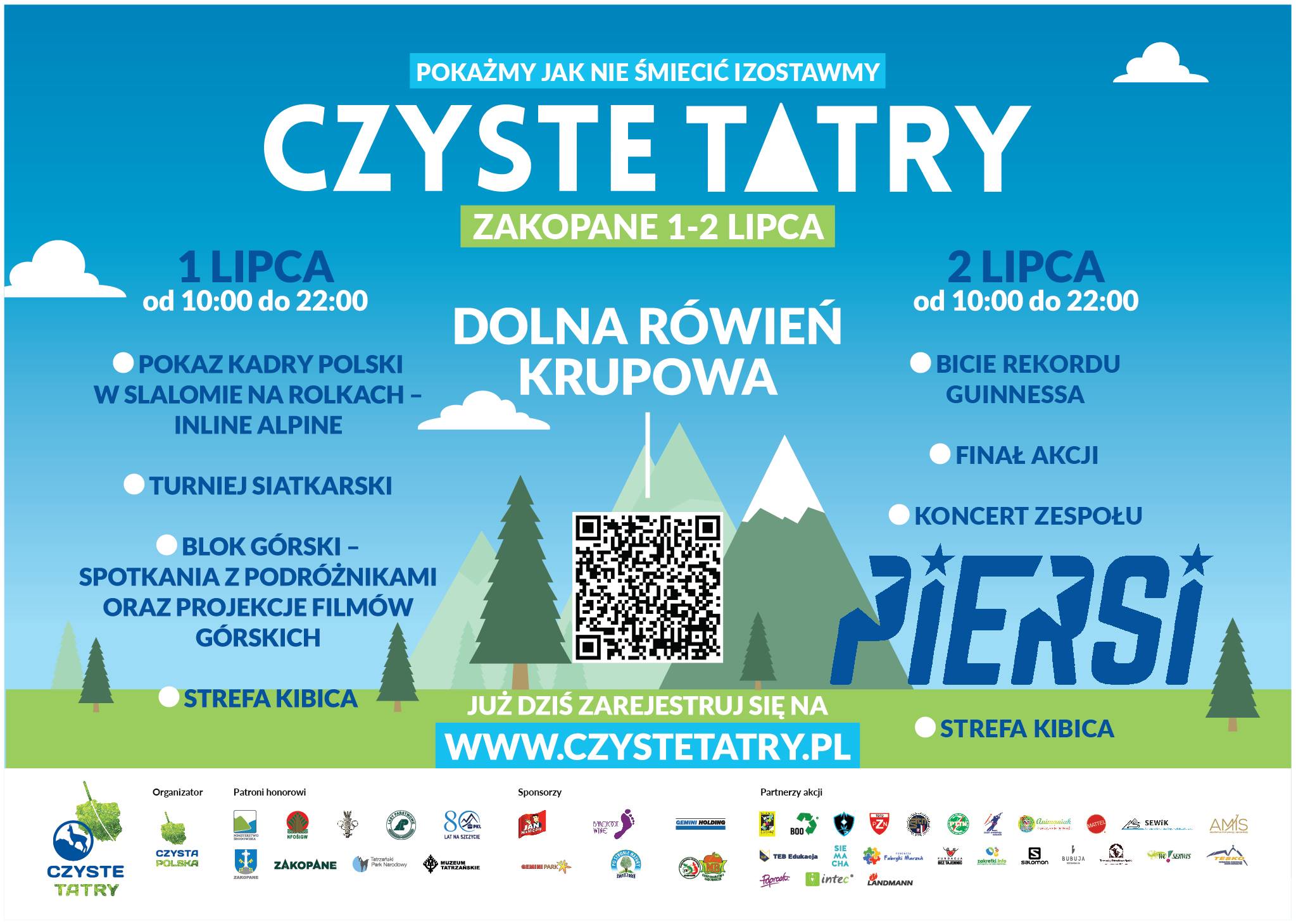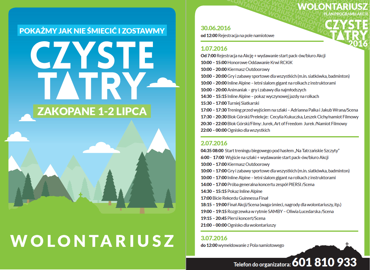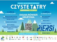 Sercem wydarzeń będą Tatry – to dla nich wolontariusze, ambasadorzy i organizatorzy akcji Czyste Tatry zbiorą się w pierwszych dniach lipca w Zakopanem. Na kilka dni w sercu miasta, na Równi Krupowej, stanie miasteczko akcji. Punktem centralnym będzie biuro Akcji, gdzie już od 30 czerwca będzie można rejestrować się na dostępnym dla wszystkich, bezpłatnym polu namiotowym. Z kolei przez cały piątek, 1 lipca, będzie można zapisywać się do udziału w akcji. W miasteczku organizatorzy, partnerzy i sponsorzy akcji zapewnią mnóstwo atrakcji, m.in.: kiermasz outdoorowy, blok górski z prelekcjami i pokazami filmów, turniej siatkarski oraz treningi przed wyjściem na tatrzańskie szlaki. Główny dzień akcji – 2 lipca – w całości poświęcony będzie na sprzątanie szlaków. Tego dnia wolontariusze sprawdzą swoje możliwości przy biciu rekordu Guinnessa. Wysiłek wszystkich sprzątających uczestników zwieńczy koncert zespołu Piersi.