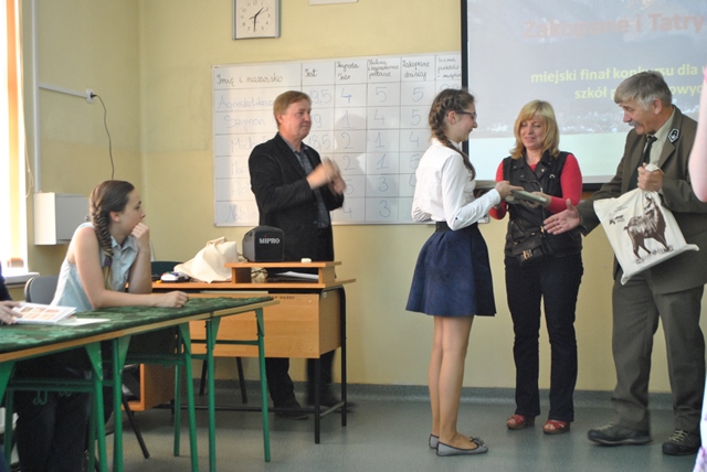 Na zakończenie komisja konkursowa wręczyła nagrody, które ufundowała Rada Rodziców szkoły i Tatrzański Park Narodowy. Dyrektor szkoły Piotr Kopeć pogratulował wszystkim uczestnikom, a szczególnie najlepszym uczniom i zaprosił do udziału w kolejnym roku! Jeszcze raz gratulujemy i mamy pewność, że kolejni uczniowie dobrze znają najbliższe środowisko - Zakopane i mogą być przewodnikami dla innych.