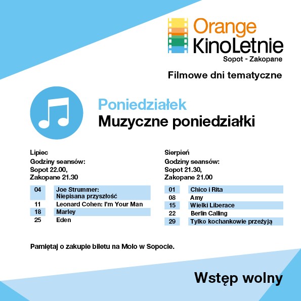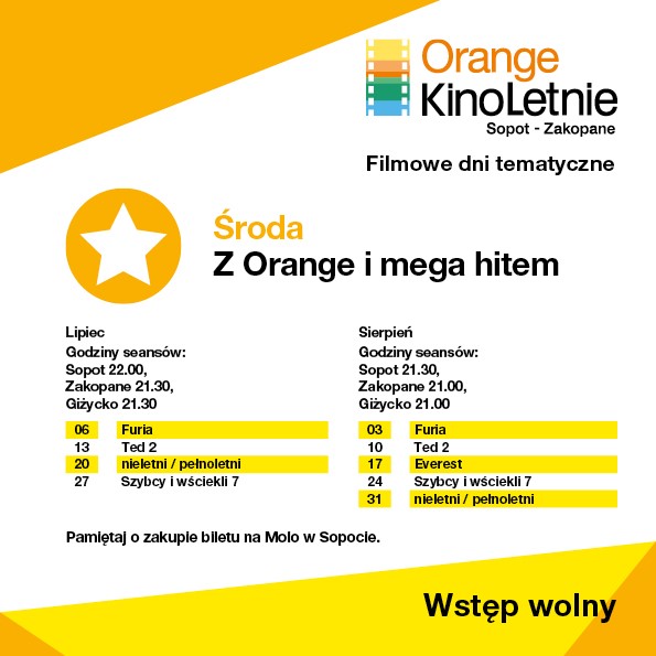 9. edycja najdłuższego wakacyjnego festiwalu filmowego Orange Kino Letnie Sopot-Zakopane startuje 1 lipca. Codziennie przez 62 dni wakacji, aż do końca sierpnia, w letnich kinach w Sopocie i Zakopanem odbywać będą się bezpłatne projekcje filmowe. Plenerowe projekcje ponownie zawitają do Giżycka. We wszystkie środy i czwartki, począwszy od 6 lipca, festiwalowe filmy obejrzą fani kina, którzy spędzą swoje urlopy na Mazurach. W tegorocznym programie znalazły się tytuły docenione na najważniejszych międzynarodowych festiwalach oraz największe produkcje z całego świata. Do tej pory, podczas ośmiu edycji, festiwalowe filmy obejrzało ponad 800 tysięcy widzów, podczas 2 821 seansów.