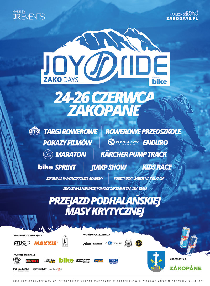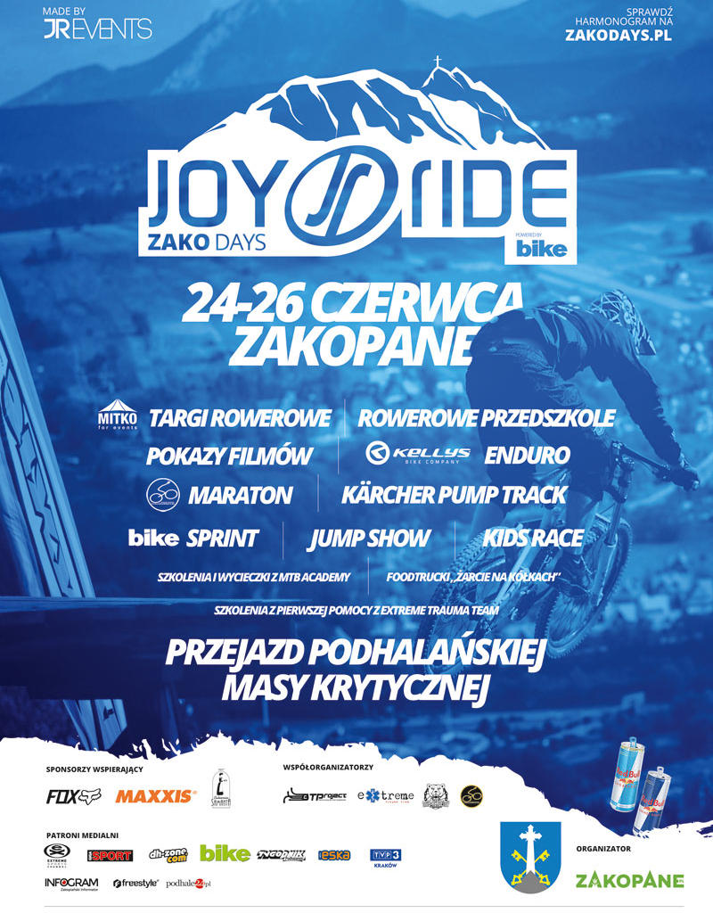 Już pod koniec czerwca spotkamy się po raz drugi w samym sercu Zakopanego na Dolnej Równi Krupowej. Na 3 dni zmienimy zimową stolicę Polski na rowerową! Od 24 czerwca aż do 26 Joy Ride’owe miasteczko wypełnią namioty czołowych firm rowerowych, tuż obok nich powstanie rowerowe przedszkole, a w jego ramach odbędzie się kilka mini dyscyplin specjalnie dla dzieciaków. To wszystko podczas weekendu otwierającego sezon letni w Zakopanem.