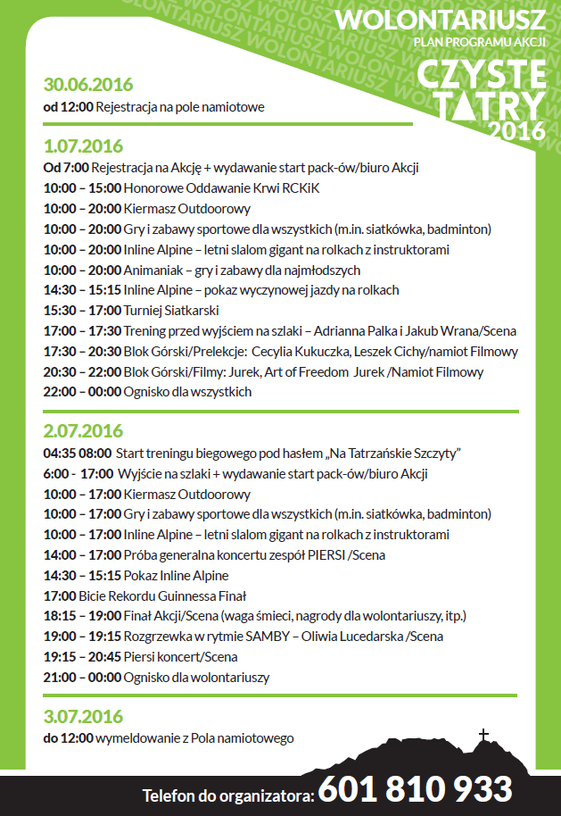 Sercem wydarzeń będą Tatry – to dla nich wolontariusze, ambasadorzy i organizatorzy akcji Czyste Tatry zbiorą się w pierwszych dniach lipca w Zakopanem. Na kilka dni w sercu miasta, na Równi Krupowej, stanie miasteczko akcji. Punktem centralnym będzie biuro Akcji, gdzie już od 30 czerwca będzie można rejestrować się na dostępnym dla wszystkich, bezpłatnym polu namiotowym. Z kolei przez cały piątek, 1 lipca, będzie można zapisywać się do udziału w akcji. W miasteczku organizatorzy, partnerzy i sponsorzy akcji zapewnią mnóstwo atrakcji, m.in.: kiermasz outdoorowy, blok górski z prelekcjami i pokazami filmów, turniej siatkarski oraz treningi przed wyjściem na tatrzańskie szlaki. Główny dzień akcji – 2 lipca – w całości poświęcony będzie na sprzątanie szlaków. Tego dnia wolontariusze sprawdzą swoje możliwości przy biciu rekordu Guinnessa. Wysiłek wszystkich sprzątających uczestników zwieńczy koncert zespołu Piersi.
