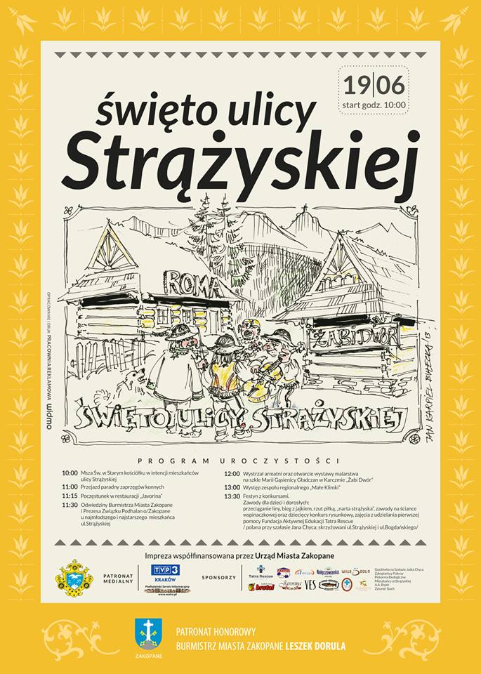 Serdecznie zapraszamy 19 czerwca na „Święto Ulicy Strążyskiej”. Uroczystości rozpoczną się o godz. 10.00 Mszą Świętą w Starym Kościółku w intencji mieszkańców ul. Strążyskiej. Później przejazd paradny zaprzęgów konnych i poczęstunek w restauracji "Jaworina".