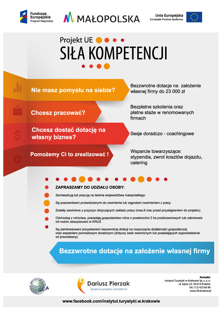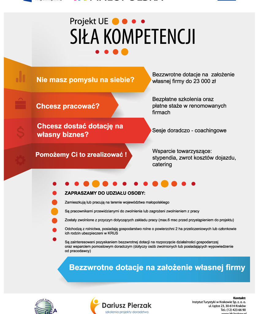 Instytut Turystyki w Krakowie Sp. z o. o. wraz z Partnerem, zaprasza do udziału w projekcie Siła Kompetencji realizowanym w ramach Podziałania 8.4.2 Adaptacja do zmian, współfinansowanego w ramach Regionalnego Programu Operacyjnego Województwa Małopolskiego na lata 2014-2020.