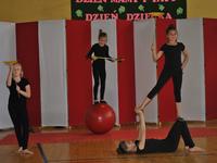 A na zakończenie w sali gimnastycznej wystąpiła grupa cyrkowo-akrobatyczna z udziałem naszych uczniów. Grupa przygotowana przez Panią Ewę Pręgowską wprawiła w zachwyt publiczność, która mogła zobaczyć trudne układy akrobatyczne, jazdę na monocyklu, elementy żonglerki i wiele innych.