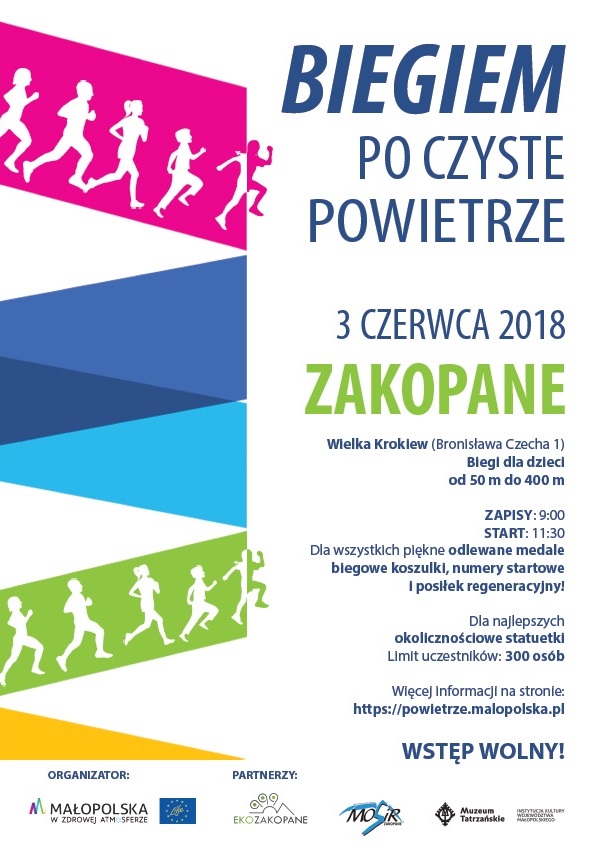 Zapraszamy do udziału w wydarzeniu “Małopolska w zdrowej atmosferze – Biegiem po czyste powietrze” którego celem jest promocja aktywności na świeżym powietrzu wśród mieszkańców Małopolski. Bieg odbędzie się 3 czerwca 2018 r. (niedziela) w godzinach 11:30-12:10 w Zakopanem na terenie Wielkiej Krokwi Stanisława Marusarza przy ul. Bronisława Czecha 1.