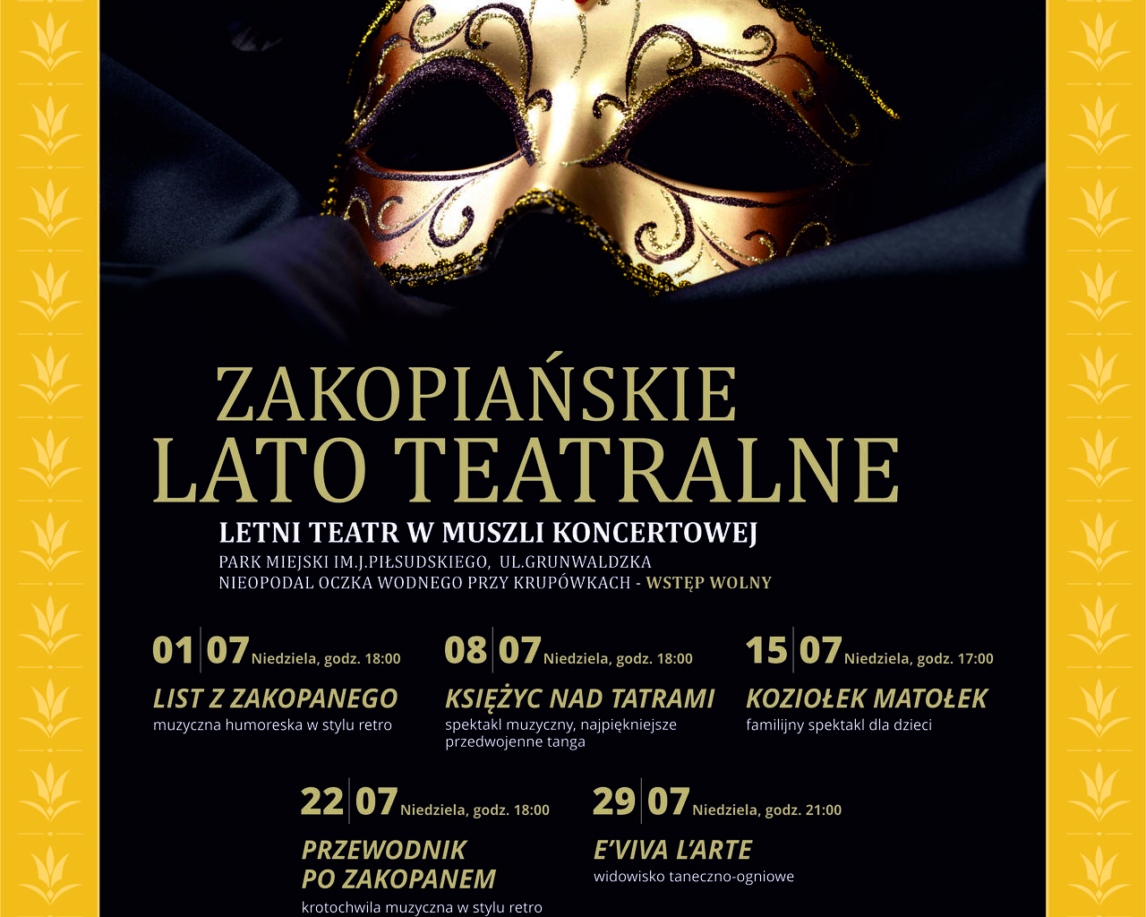 ZAKOPIAŃSKIE LATO TEATRALNE & LETNI TEATR W MUSZLI KONCERTOWEJ jest niecodzienną propozycją kulturalną, artystyczną, rozrywkową oraz turystyczną przygotowaną przez artystów, dla których Tatry a w szczególności Zakopane są szczególnym miejscem.