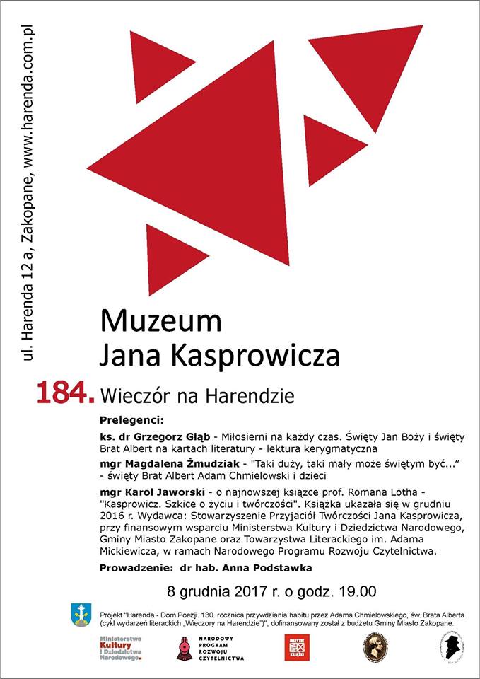 Stowarzyszenie Przyjaciół Twórczości Jana Kasprowicza zaprasza na ostatnie spotkanie w tym roku, realizowane w ramach projektu "Harenda - Dom Poezji. 130. rocznica przywdziania habitu przez Adama Chmielowskiego, św. Brata Alberta (cykl wydarzeń literackich„Wieczory na Harendzie”).