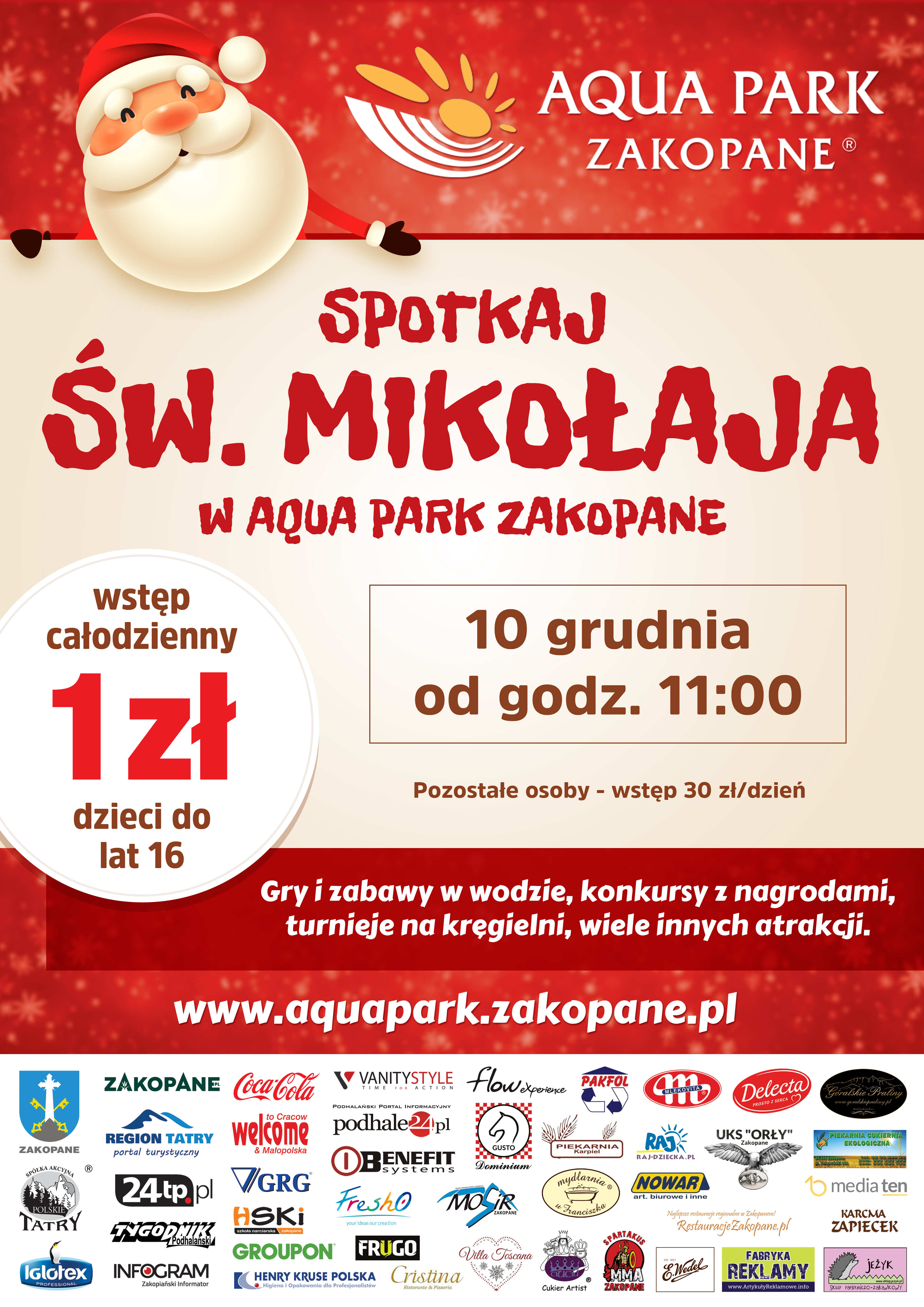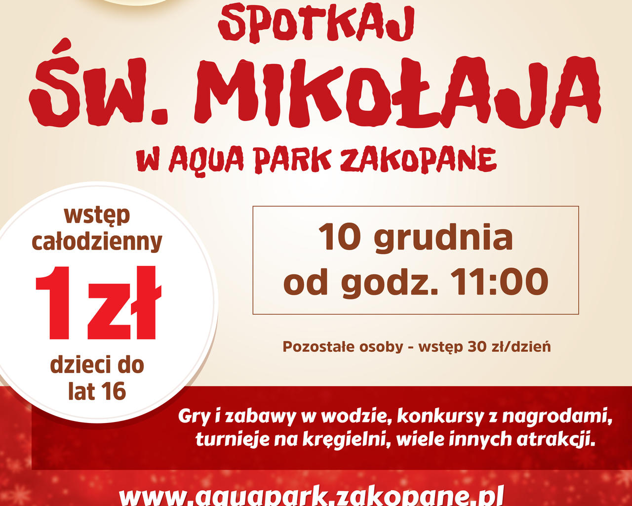 MIKOŁAJKI w Aqua Park Zakopane już 10 grudnia od 10:00. Tradycyjnie jak co roku Aqua Park Zakopane z okazji DNIA ŚW. MIKOŁAJA przygotował dla dzieci z Zakopanego i okolic mnóstwo atrakcji.