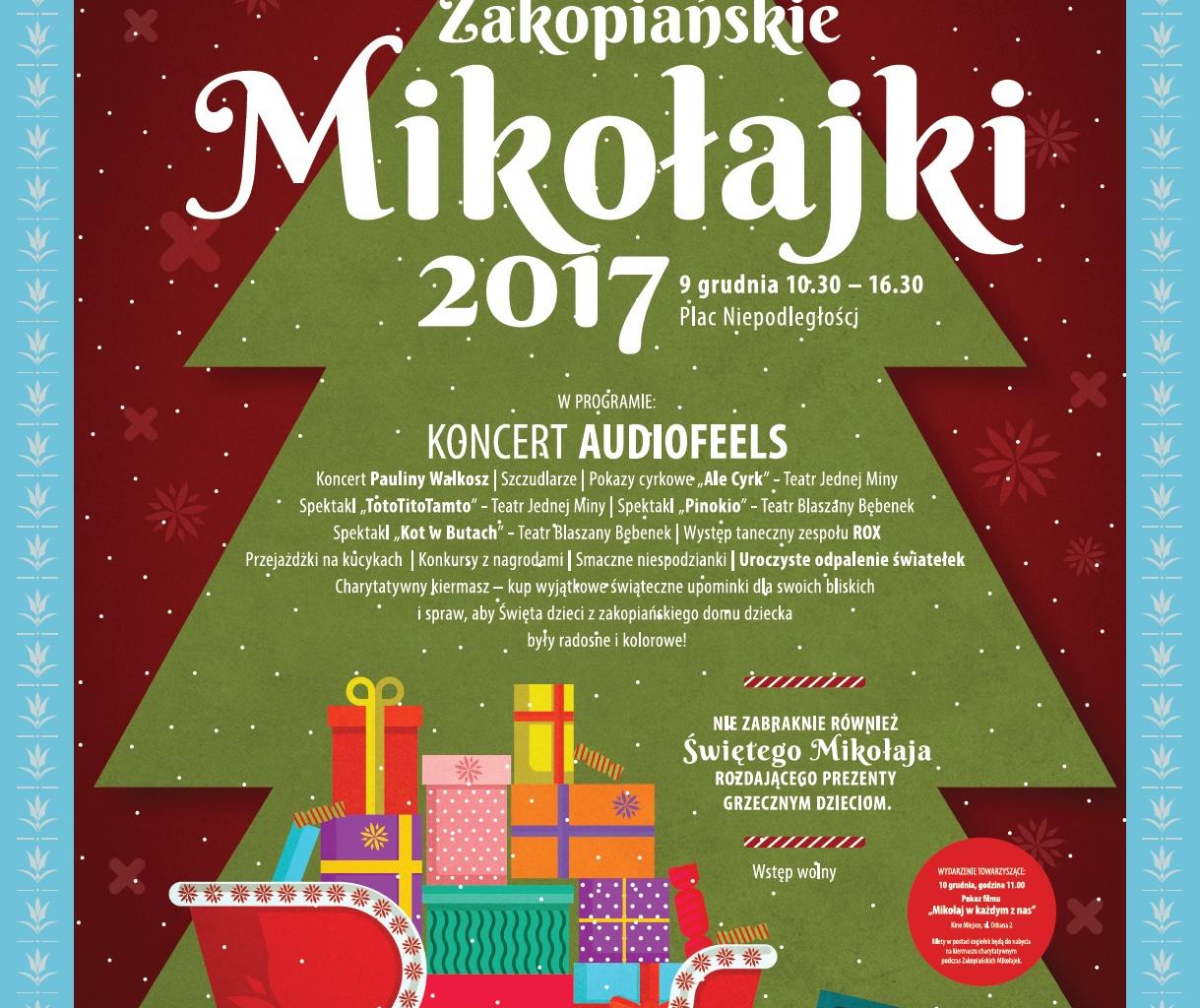 Burmistrz Miasta Zakopane Leszek Dorula zaprasza na Festyn Rodzinny Zakopiańskie Mikołajki. 9 grudnia w godzinach 10.30 – 16.30 Plac Niepodległości przy Krupówkach. Tegoroczną gwiazdą będzie zespół AudioFeels.