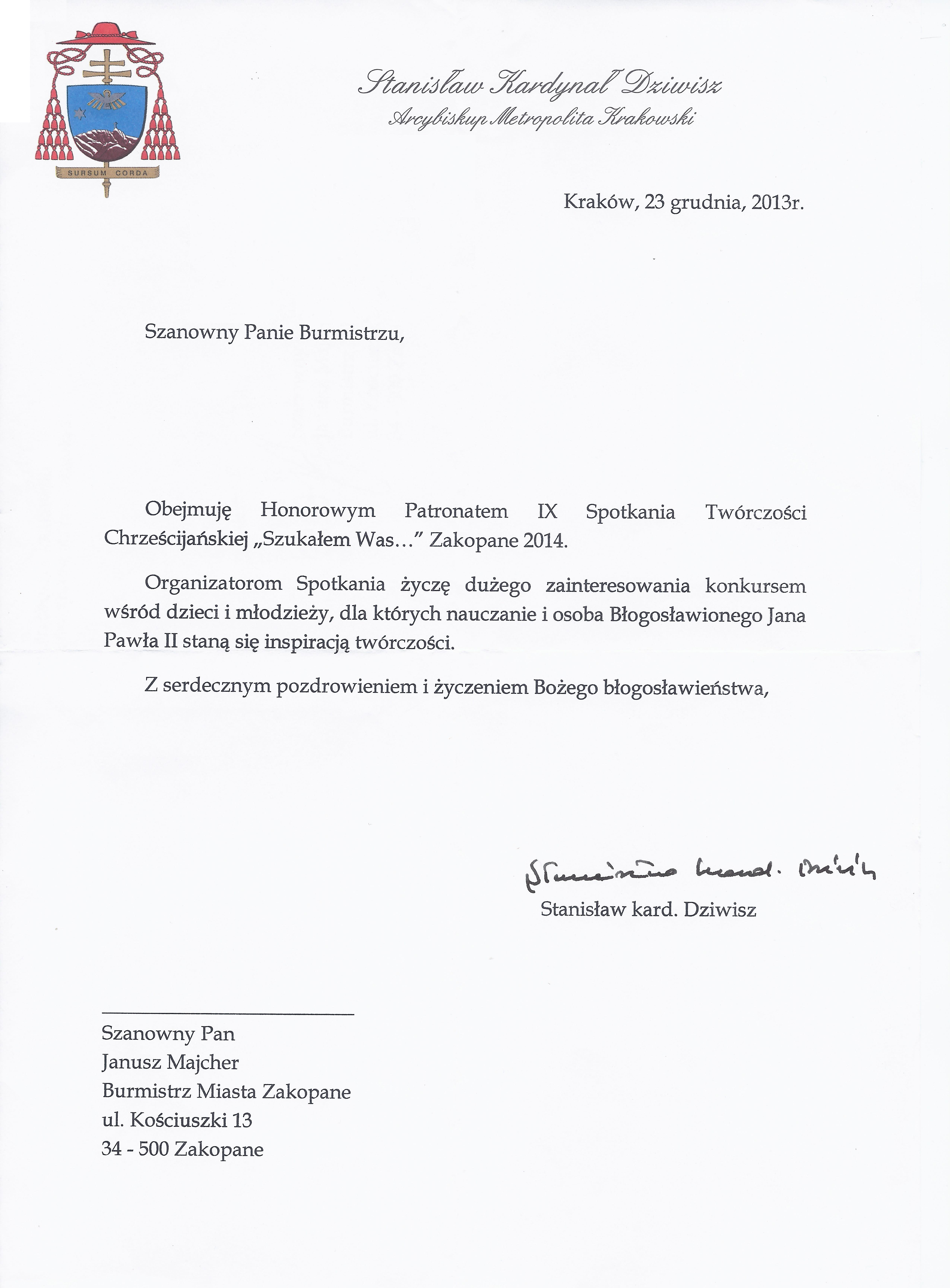 Zapraszamy do udziału w IX Spotkaniach Twórczości Chrześcijańskiej „Szukałem Was…” pod patronatem JE ks. Kardynała Stanisława Dziwisza, które odbędą się w Zakopanem w dniach 24-25 maja 2014 r.