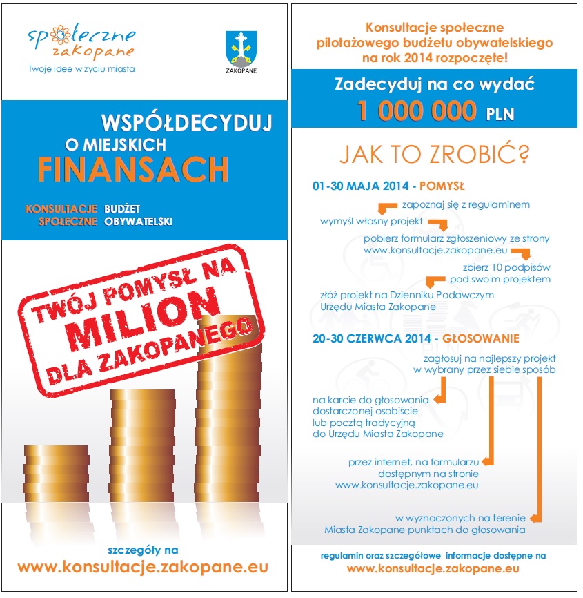 Burmistrz Miasta Zakopane ogłasza przeprowadzenie konsultacji społecznych dotyczących pilotażowego budżetu obywatelskiego na 2014 rok. Konsultacje zostaną przeprowadzone w okresie od dnia 01 maja 2014 r. od godziny 7:30 do dnia 30 czerwca 2014 r. do godz. 15:00.