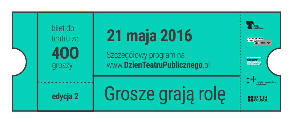 21 maja teatry publiczne w całej Polsce zagrają swoje spektakle w ramach organizowanej już po raz drugi akcji biletu za grosze. W ubiegłym roku jego cena (250 groszy) nawiązywała do okrągłej rocznicy istnienia teatru publicznego w Polsce. W tym roku odwołuje się z kolei do rocznicy śmierci dramatopisarza wszech czasów – Williama Shakespeare’a. Bilety w specjalnej cenie 400 groszy (4 zł) będzie można kupić osobiście w kasach teatrów.
