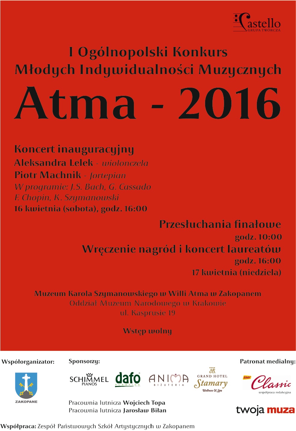 W dniach 16 i 17 kwietnia w Muzeum Karola Szymanowskiego w Willi Atma w Zakopanem odbył się finał I Ogólnopolskiego Konkursu Młodych Indywidualności Muzycznych ATMA – 2016 organizowany przez Agencję Koncertowo-Wydawniczą „Castello Grupa Twórcza” oraz Burmistrza Miasta Zakopane Leszka Dorulę.