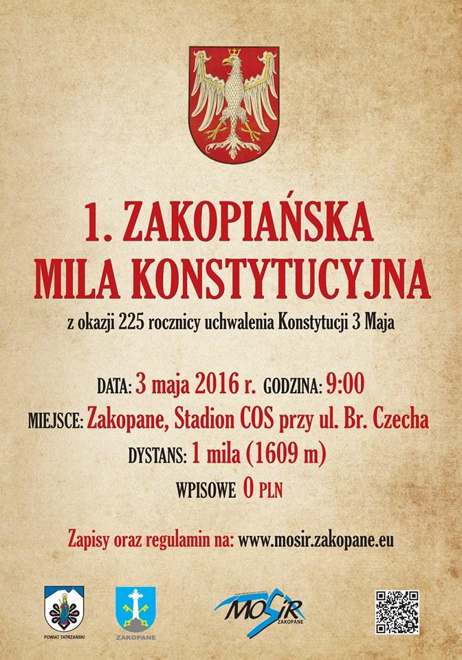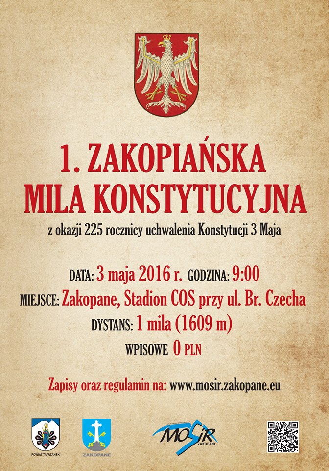 3 maja na stadionie zakopiańskiego COS-u zostanie rozegrany bieg I Zakopiańska Mila Konstytucyjna. Zawody zorganizowane zostaną dla uczczenia 225. rocznicy uchwalenia Konstytucji 3 Maja.